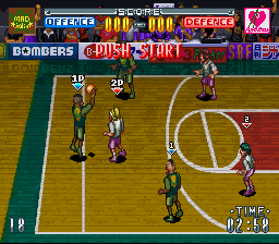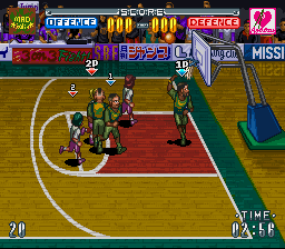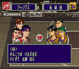 J'imagine que ce jeu de basket est tiré d'un manga mais il ne dispose pas de mode story entrecoupé de cut-scenes, contrairement aux jeux Slam Dunk (vus en page 35). Ici on joue à 3 contre 3 sur une moitié de terrain. On dispose de 3 boutons en attaque : passer, sauter, et tirer. En défense on peut sauter pour contre ou tenter d'intercepter. Malgré son design cartoon, le jeu ne propose pas de coups spéciaux ou autres exagérations à la NBA Jam. Le gameplay est forcément nerveux mais, malgré le nombre réduit de joueurs sur le terrain, plutôt confus. En défense il est particulièrement difficile de voir qui on dirige et d'intercepter l'adversaire. En attaque on aurait aimé pouvoir faire des feintes, ou accélérer, car ici on manque d'options pour varier son jeu. Ca ne doit pas être particulièrement déplaisant à pratiquer à deux, mais ce jeu pas joli du tout est tout de même loin de s'imposer au sein de la ludothèque sportive bien fournie de la Snes. Moyen