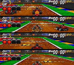 Mais par rapport à Mario Kart alors, quoi de neuf ? Quelques petites choses tout de même. D'abord, on peut ramasser du carburant spécial sur la piste qui remplit une jauge ; lorsque cette dernière est pleine, on peut déclencher un turbo qui dure quelques instants. Ensuite, les armes ne sont pas aléatoires, le type de bonus étant visible quand on passe dessus et se trouvant toujours au même endroit pendant toute la course. Enfin il est possible de customiser son véhicule entre les courses avec l'argent remporté en fonction de son classement. De plus, et c'est assez surprenant, le titre est jouable selon différentes vues : on a la vue par défaut, qui reproduit exactement le visuel de Mario Kart, et des vues aériennes plus ou moins éloignées qui changent le gameplay et le rapprochent des F1 Grand Prix du même éditeur sur la même machine (voir page 32), sauf qu'ici ces vues aériennes sont assez moches et pas très pratiques à utiliser pour certaines. Mais c'est techniquement un petit tour de force pour la Snes, d'autant que chaque joueur peut choisir une vue différente et on en trouve même d'assez insolites puisqu'il est possible de jouer à partir de la vue de la carte vue de coté (bonne chance !). Et la performance technique ne s'arrête pas là, il faut aussi parler de la partie sonore : si les musiques n'ont rien de spécial, les courses sont en revanche commentées par deux journalistes (qui apparaissent à l'écran en mode 1 joueur) avec des nombreuses voix digitalisées ! Un troisième journaliste apparait même parfois (son visage est alors affiché dans une petite fenêtre) pour apporter une info.