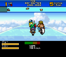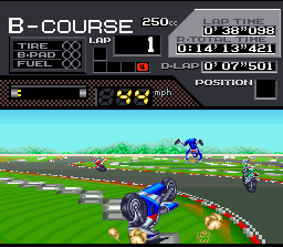 Techniquement, c'est moyen pour de la Snes avec une route animée en mode 7 à la Mario Kart et des graphismes corrects mais sans plus. Le bruit du moteur est discret.