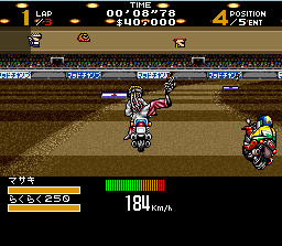 Le petit plus de Super Mad Champ ? Eh bien lorsqu'on fait une chute, il faut remonter sois-même sur sa moto. Mais alors qu'on se dirige vers sa monture, un autre motard s'arrête et met pied à terre. La solidarité entre "bikers" en action ? Que nenni, le type vient en fait pour bastonner ! Et en effet on se rend compte que le bouton Y qui servait jusqu'ici à accélérer permet maintenant de donner des coups tandis que le bouton B sert à sauter. On peut même se mettre en garde avec A et il est possible de réaliser des combos. Plus fort encore : on peut décider de fuir le combat (c'est conseillé de toute façon pour ne pas perdre trop de temps) mais de le faire en s'emparant de la moto de l'adversaire !