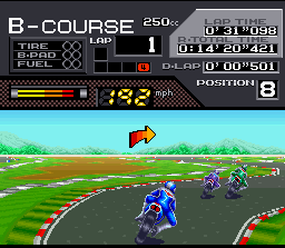 Le jeu est censé être une conversion de Suzuka 8 Hours en arcade mais, très honnêtement, j'ai bien du mal à voir les points communs ! Les graphismes et les modes de jeu sont différents, la conduite n'a rien à voir et le défilement de la piste, totalement différent en arcade, donne à cette dernière version une impression de vitesse bien plus efficace. Cette cartouche Snes n'en reste pas moins assez sympathique et tout à fait jouable, mais il est certain qu'on a fait bien mieux dans le genre depuis.