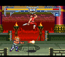 Voici un nouveau jeu de combat en versus signé Culture Brain et, sans surprise, il reprend le même moteur déjà utilisé dans les autres titres du genre de l'éditeur sur Snes. Donc au menu : beaux sprites, maniabilité correcte, mais animation saccadée. Ce jeu a la particularité de proposer un mode "histoire" assez travaillé mettant en scène les persos de la série des Super Chinese World et dans lequel on est amené à faire évoluer son héros et à faire des choix pour orienter l'intrigue dans une direction ou une autre. Les autres modes de jeu sont plus classiques avec un enchainement classique de combats contre le CPU et l'indispensable "versus" pour affronter un autre joueur humain. Le gameplay est assez simplifié par rapport aux autres jeux du genre et possède ses petites originalités. Ainsi on dispose seulement de 2 boutons pour attaquer : attaque rapide (normalement coups de poing) et attaque forte (coups de pied) qu'on peut combiner aux directions du pad pour sortir des coups divers, tandis que les coups spéciaux s'exécutent avec les habituelles manipulations à la Street Fighter 2. Un autre bouton sert à concentrer son énergie pour charger une barre servant à placer des super coups, et un dernier bouton sert à utiliser des objets qui se manifestent souvent sous la forme de pièges à poser sur l'aire de combat. En mode versus, il est possible de choisir ses coups spéciaux dans une liste propre à chaque perso, ainsi que l'objet transporté, et enfin un style de combat qui influe sur les caractéristiques (plus ou moins fort ou rapide). En mode histoire, tout cela est imposé. Le jeu est très joli, les combattants charismatiques, et le gameplay abordable. Mais le système de jeu manque de profondeur, les personnages sont peu nombreux et l'animation est donc très saccadée. C'est donc loin d'être un "hit" mais plaira surement à ceux qui comme moi éprouvent une certaine sympathie envers les jeux de baston Culture Brain. Moyen