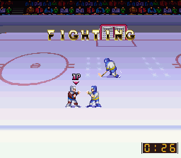 Super Ice Hockey / Super Hockey 94 (Party Room / Sunsoft - 1994) Étonnant que Sunsoft se soit lancé dans ce type de jeu... La vue en profondeur (grâce au fameux "zoom" du hardware) me fait penser à celle de World League Basketball (aussi sur Super Nintendo), et la qualité du gameplay aussi je crois Quant à la traversée du terrain en 1 seconde grâce au dash, c'est digne de NBA Jam |