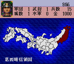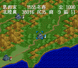 A l'image des softs de l'éditeur Koei, ce titre est un jeu de stratégie / gestion se déroulant pendant le Japon médiéval et mettant en scène des personnages historiques parmi lesquels on choisit son héros en début de partie, puis un scénario, et c'est parti ! C'est parti pour quoi ? Bin ... je ne sais pas trop, car c'est typiquement un jeu dans lequel il est impossible de progresser sans notice et sans comprendre la langue : tous les menus sont en kanji et aucun ne bénéficie d'une icône ou d'une illustration aidant à comprendre son utilité. Et les choisir au hasard n'a pas donné grand chose. Dommage, car la représentation isométrique à la Populous est assez jolie et les musiques agréables.