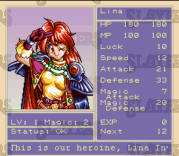 Slayers est d'abord un anime racontant l'histoire d'une magicienne dans un monde d'heroic-fantasy. Le ton est très léger, les gags fusent dans tous les sens et les personnages ridicules se croisent au fil des épisodes. La série a eu pas mal de succès en France, mais bien après la sortie de ce jeu exclusif au marché japonais mais heureusement traduit grâce à un patch réalisé par des fans et finalisé à 100% en 2010. Le jeu est un J-RPG bien old-school tout ce qu'il y a de plus classique. Vue de dessus, dialogues dans les villages, combats aléatoires au tour par tour dans les donjons, points d'expérience, magies ... Rien qu'on ai jamais vu avant. Par contre il n'y a pas de déplacements sur carte : on choisit directement l'endroit ou on souhaite se rendre à partir d'un menu quand on quitte une ville par exemple. L'histoire raconte comment l'héroine Lina Inverse se fait "piéger" par une bande de villageois qui la jettent dans un puit en espérant qu'elle ira botter les fesses des gobelins qui s'y trouvent. Et comme ils n'ont pas de quoi payer cette magicienne qui ne fait pas dans le bénévolat, si jamais les gobelins et elle-même pouvaient s'entretuer, ce serait encore mieux ! L'intérêt principal de ce titre est son ambiance loufoque directement héritée de la série, avec des dialogues assez drôles et des personnages hauts en couleur. Pour le reste c'est un peu trop classique, avec le même système de menus que les 1ers Dragon Quest et le même système de combat. La réalisation fait très "NES" dans les phases d'exploration. Les sprites sont ridiculement petits, les décors manquent de couleurs et les visages des personnages n'apparaissent pas pendant les dialogues. C'est un peu plus joli pendant les combats, avec des graphismes beaucoup plus fins, tout comme dans les écrans de status qui présentent de jolies illustrations des personnages. On bénéficie également de quelques (rares) illustrations plein-écran pour illustrer certaines scènes. Les musiques sont tout sauf remarquables. Classique dans son déroulement et médiocre techniquement, Slayers plaira éventuellement aux fans de l'anime et laissera de marbre tous les autres. Moyen