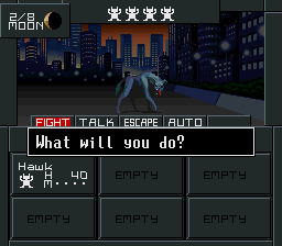 Le suite de Shin Megami Tensei se déroule dans un Tokyo post-apocalyptique qui fut ravagé par une invasion de démons. La ville s'est reconstruite et la nouvelle société est régie par des cultes religieux. Le héros est un amnésique qui évolue en tant que gladiateur : il se bat pour de l'argent. Au début du jeu, alors qu'il s'entraine pour un combat important dans une simulation en réalité virtuelle, il est contacté dans ce monde numérique par un mystérieux personnage en chaise roulante qui l'avertit d'une nouvelle invasion de démon et lui donne les moyens de communiquer avec ces derniers. Le gameplay est similaire à celui du premier jeu. On évolue sur une carte de la ville en extérieur et on se déplace case par case en vue subjective en intérieur. Les combats aléatoires au tour par tour sont toujours présents, tout comme la nécessité de discuter avec les démons pour les recruter dans son équipe, puis les transformer en démons plus puissants. Le coté aventure est toujours aussi important avec de nombreux personnages à rencontrer et pas mal d'exploration nécessaire pour progresser. C'est donc toujours aussi plaisant à pratiquer. La réalisation fait des progrès avec des décors plus variés et plus beaux et une interface remaniée plus claire. On remarque également que la difficulté a été rabaissée : il est très rare de se faire tuer par un démon trop puissant rencontré sans prévenir au coin d'une rue, et certains démons moins belliqueux que d'autres se laissent convaincre largement plus facilement pour joindre le héros. Shin Megami Tensei 2 bénéficie lui aussi d'un patch de traduction et se révèle également très agréable à jouer. J'apprécie particulièrement le mélange entre un gameplay de RPG à l'occidentale (renvoyant aux classiques Bard's Tale, Might and Magic et Wizardry), et un scénario, un univers, une ambiance, qui sont typiquement japonais avec leur façon décomplexée de plonger la religion au cœur de l'intrigue, ou de mettre en scène des personnages charismatiques (même si on échappe pas à certains clichés). Je pense que c'est un jeu à faire. Des remakes sont sortis sur Playstation et GBA. Là encore, la version PS semble largement améliorée. Mais à ma connaissance, on ne peut pas y jouer en anglais. Bien Shin Megami Tensei If ... (Atlus - 1994)