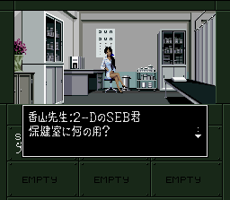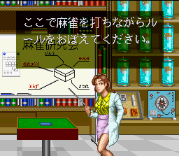 Je ne peux pas vraiment dire ce que vaut ce jeu de mahjong en ce qui concerne le niveau du CPU lorsqu'on l'affronte mais en tout cas un effort tout particulier a été mis dans sa présentation. Les nombreux modes de jeu et écrans d'options sont introduits par moultes illustrations mettant en scène de jolies filles, et sont parfois très humoristiques. Ainsi j'adore l'écran de présentation des défis (dans lesquels on va renforcer sa connaissance des différentes combinaisons possibles) : on y voit une jeune scientifique dans un labo ou des pièces de mahjong se trouvent à l'intérieur de cuves comme des spécimens biologiques. Et ce soin mis dans la mise en scène se poursuit pendant la partie puisque des vues différentes sont proposées suivant qu'on joue contre 1, 2 ou 3 adversaires simultanément. D'autres modes de jeu proposent des tournois et enfin on commence par créer son avatar en choisissant jusqu'à son groupe sanguin, sa taille et son lieu de naissance (super important tout ça au Mahjong, n'en doutons pas). Bon, graphiquement ce n'est pas renversant mais le tout est très sympathique. Super Nichibutsu Mahjong 2 (Nichibutsu - 1993)