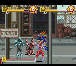 Dans cette suite qui se joue à 2 simultanément, Sonic Blastman et 2 autres potes super-héros kitsch doivent repousser une invasion extra-terrestre. Si malheureusement les stages bonus qui reprenaient le principe de l'arcade ont disparu, tout le reste est largement mieux dans ce second épisode. Sans être réellement beaux, les graphismes sont améliorés : les sprites sont plus petits mais mieux dessinés et surtout mieux animés. La vitesse du jeu est d'ailleurs accrue, ce qui rend l'expérience beaucoup plus agréable. La palette de coups a bien été enrichie. On dispose de 2 attaques : une rapide qui déclenche des combos et une autre un peu plus lente mais qui met l'ennemi à terre. On peut sauter et enchainer l'une des 2 attaques, frapper en l'air de 2 façons, et chopper l'ennemi soit pour le projeter soit pour lui asséner une attaque au corps à corps. Le super coup de poing en nombre limité est toujours là mais on peut le transformer en projectile pour frapper à distance. Enfin le bouton A sert à effectuer une roulade qui fonctionne exactement comme dans King of Fighters : on est invincible pendant et ça permet de passer derrière l'adversaire pour le frapper. C'est cette roulade qui, à mon sens, transforme ce titre autrement vraiment moyen en beat-them-all méritant d'être joué. Ca dynamise les combats, il faut l'utiliser judicieusement contre les boss, et les ennemis de base nous poussent à nous en servir, comme par exemple les porteurs de bouclier, ou ceux qui ont une priorité de malade dans leurs attaques et qu'on aurait du mal à attaquer autrement. Notons d'ailleurs quelques petites originalité dans les adversaires comme ces "kamikaze" qui explosent quand on les frappe (et nous blessent si on est trop près), mais dans l'ensemble ils se répètent un peu trop d'un niveau à l'autre, niveaux qui sont heureusement moins longs que dans le 1er épisode. Si vous accrochez à son design, Sonic Blastman 2 est un beat-them-all sympa que je vous recommande d'essayer. Assez Bien