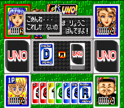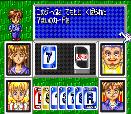Super Uno est l'adaptation du jeu de société Uno. Le but de ce dernier est de se débarrasser de toutes ses cartes, qui ont pour la plupart des rôles spécifiques. J'imagine que cette adaptation est réussie à la vue de ses nombreuses options et modes de jeu et de sa réalisation tout à fait correcte. Bien que jusqu'à 6 personnages puissent s'affronter en même temps (en fonction du mode choisit), seuls 2 joueurs humains peuvent participer. Malheureusement tout est en japonais, des menus aux petites répliques lancées par les personnages en passant par le très complet tutorial décrivant en détail les règles et le rôle de chaque carte. Dommage qu'aucune traduction n'existe car je ne suis pas certain que les jeux de Uno soient très nombreux sur les consoles de jeu de cette génération. Je me garderai bien quand à moi de donner une appréciation vu que je ne sais pas du tout jouer à ce jeu !