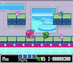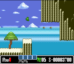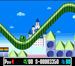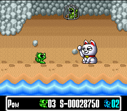Destiné aux jeunes enfants, ce titre fait partie de la série Wagyan Land (commencée sur Famicom) et est un jeu de plate-forme très simple mettant en scène un petit dinosaure-robot vert sur une île tropicale façon Wonderboy. Il peut sauter et tirer en poussant une sorte de cri qui paralyse les ennemis et qui gagne en puissance en fonction des bonus qu'on ramasse. Régulièrement, il croise des monstres mignons comme un champignon ou un "manekineko" qui lui lancent des défis. Ces derniers sont des petits jeux de réflexion très simples ... à condition que vous lisiez le japonais ! En effet il s'agira de répondre à un question sur les habitudes alimentaires d'un animal ou bien de reconnaitre une image en train de s'afficher avant qu'elle ne devienne totalement nette. Pour un petit japonais, ce jeu tout mignon est surement très sympathique. Le gamer non-japonisant passera en revanche son chemin après avoir cependant jeté un œil sur les graphismes dépouillés mais mignons bénéficiant d'un design tout simple qui fait mouche. Super Wagyan Land 2 (Namco - 1993)