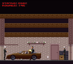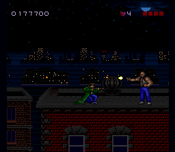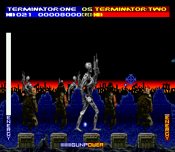 Ce jeu reprend l'intrigue du film du même nom et nous met dans la peau du résistant Kyle Reese qui combat des robots dans un futur ou l'humanité est la proie des machines. On se déplace donc en vue de coté dans des décors représentant un champ de bataille. Notre héros peut s'abaisser, sauter et tirer dans toutes les directions avec un fusil mitrailleur. Les ennemis sont divers types de robots et des machines volantes. Des boss sont également présents bien entendu. Le level design est ultra minimaliste : on avance et on tire, tout en grimpant parfois sur des plate-formes grâce à des échelles. Le jeu est assez dur car les ennemis tirent dès qu'ils apparaissent à l'écran : il est quasi impossible d'éviter leurs tirs si on ne sait pas précisément ou ils vont apparaitre. L'action est très répétitive bien que certains niveaux nous placent parfois dans un véhicule pendant de courtes séquences. The Terminator est donc un side-scroller réduit à sa plus simple expression : dépouillé et franchement peu passionnant. Certains titres s'en sortent avec cette recette minimaliste en compensant avec une réalisation exceptionnelle, comme Rendering Ranger. Mais ici, et malgré un scrolling très fluide, on est loin des exploits du titre de Manfred Trenz. Le sprite du héros est hideux, son animation ratée, les ennemis ne ressemblent souvent à rien, les décors sont tristes, sombres et répétitifs et surtout, SURTOUT, des bruitages atroces comme le "boing" entendu lorsqu'on saute ou le bruit de l'arme du héros qui est in-su-por-ta-ble (problème d'émulation ?). Les choses s'améliorent un peu dans le second niveau qui voit Kyle Reese revenir dans le passé et se battre contre des loubards dans les rues de Los Angeles, tandis que les phases de plate-forme se font un peu plus présentes et qu'on trouve même un peu d'exploration. Le jeu est toujours aussi laid et mal animé et sa jouabilité toujours aussi approximative mais on prend un peu plus de plaisir ... un peu seulement. Mediocre T2 : The Arcade Game (Probe / Acclaim - 1993)