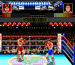 Ce jeu de boxe vu de coté ne s'embarrasse pas d'un gameplay complexe puisqu'il suffira au joueur de diriger son sportif dans le ring et d'appuyer au bon moment sur l'un des 2 seuls boutons gérés pour balancer un coup de poing au petit bonheur la chance. En fonction de la distance entre les combattants, l'animation du coup porté sera différente tandis que les parades et esquives semblent sortir plus ou moins automatiquement. Et aléatoirement. Il en résulte un gameplay assez brouillon et pas franchement passionnant. Techniquement les graphismes sont corrects mais l'unique musique est très énervante. Entre les combats, on peut augmenter les caractéristiques de son boxeur en choisissant un entrainement (non interactif) adéquat, ce qui sera l'occasion d'admirer quelques écrans intermédiaires. La version japonaise (Kentou Ou World Champion) est différente sur de nombreux points avec des portraits de personnages différents, tout comme la couleur des sprites, une intro avec quelques illustrations, d'autres écrans intermédiaires et surtout une jouabilité différente puisqu’ici on ne frappe qu'avec un seul bouton, le second servant à s'agripper à son adversaire. Les options permettent également de redéfinir ses touches mais les 3 niveaux de difficulté présents dans la version US ont disparu. Mais dans un cas comme dans l'autre, ce jeu de boxe reste peu amusant à pratiquer. Mediocre Tenryu Genichiro no Pro Wrestling Revolution (Jaleco - 1994)