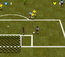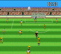 Nous avons ici un jeu de football de qualité très discutable qui fait suite au deux "Super Goal" et qui met en scène des équipes du championnat japonais. La représentation aérienne avec terrain vu verticalement rappelle un peu Super Formation Soccer, avec ici des zooms arrière lors des balles aériennes. Ces zooms sont mal implémentés et apportent beaucoup de confusion car il est bien difficile de déterminer la position de son joueur par rapport à la balle. En attaque la jouabilité est assez correcte avec un bouton de tir, un bouton de passe aérienne, un bouton de passe au sol et un bouton de passe assistée (la balle va automatiquement vers le joueur surmonté de l’icône "pass"). En défense, on regrette que la sélection du joueur le plus proche du ballon ne se fasse pas automatiquement, il faut en fait le choisir sois-même avec les touches L et R. L'animation est rapide et il est à peu près possible de construire un jeu mais les possibilités sont ultra limitées. La réalisation est pauvre si on compare avec des titres comme ISS, avec des sprites sans finesse, des sons peu variés, et des animations des joueurs très limitées. On trouve parmi les modes de jeu un championnat, un mode exhibition, une coupe paramétrable et un éditeur pour renommer les joueurs et même éditer leurs caractéristiques en répartissant des points. Il y a aussi un entrainement à diverses phases de jeu supervisé par Nobuhiro Takeda, le joueur japonais qui prête son nom au jeu. Les parties peuvent se disputer contre un ou plusieurs adversaires humains puisqu'on peut jouer à 4 simultanément. Et heureusement car l'intelligence artificielle du CPU est assez risible. Bref, un jeu de foot qui ne se foule pas trop et qu'on oubliera vite, tout comme ses 2 prédécesseurs. Mediocre Total Soccer (Domark / Acclaim - 1995)