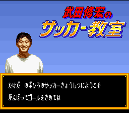 Étrangement uniquement sorti au Japon bien que mettant en scène des équipes internationales, ce jeu de foot édité par EA (mais développé par une équipe nippone) dispose d'un gameplay qui fait plus penser à celui d'un jeu de stratégie en temps réel comme Dune 2 qu'à une simulation de ballon rond classique. En effet, les matches se déroulent donc sous nos yeux sans qu'on puisse interrompre l'action et sont représentés dans une petite fenêtre en haut de l'écran (avec un moteur de jeu qui fait un peu penser à ISS, en moins joli). Le joueur intervient en donnant des directives par l'intermédiaire des boutons de la manette, comme forcer au centre, jouer sur les ailes, revenir en défense, faire une passe longue ou courte ... En fonction de ce qu'on a choisi, il est possible d'appliquer l'ordre à un joueur particulier (qu'on sélectionne en déplaçant un curseur avec la croix du pad), au joueur en possession de la balle, à une partie de l'équipe (défense, milieu de terrain, attaque) ou à toute l'équipe. Le tout se fait relativement simplement avec des combinaisons de boutons. Lors des arrêts de jeu (fautes, balle en touche ...), on peut revoir sa formation en disposant précisément chaque joueur sur le terrain. Bien que le jeu soit en japonais, la plupart des menus de l'interface sont en anglais, ce qui permet de s'adonner à Tactical Soccer sans trop de problème. Au final, on a donc entre les mains une sorte de variante des Captain Tsubasa de Tecmo, avec plus d'action, et moins de fantaisie (et de charisme). A essayer éventuellement, mais j'avoue ne pas avoir trop accroché, ayant trouvé le CPU beaucoup trop rapide et agressif pour qu'on puisse réellement établir une stratégie et apprécier les résultats de ses choix pendant les matches. Moyen Takeda Nobuhiro no Super League Soccer (Jaleco - 1994)