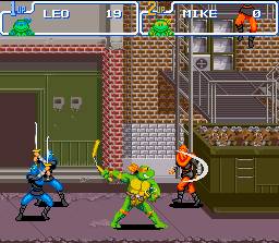 Appelé "Teenage Mutant Ninja Turtles : Mutant Warriors" au Japon, ce jeu met en scène les célèbres Tortues Ninja dans un beat-them-up calqué sur Street Fighter 2. On se bat avec 2 boutons de poing et 2 boutons de pied, les coups normaux sont nombreux, et les coups spéciaux s'exécutent avec des manœuvres comme le quart de tour au pad suivi d'un bouton. Les personnages disponibles sont les 4 tortues (rassurez vous, elles ont toutes des coups différents), leur infâme ennemi de toujours le ninja griffu Schreder, ainsi que quelques autres énergumènes, des mutants pour la plupart, venus du dessin animé ou du comics sans pour autant en être des figures récurrentes. Une femme ninja totalement inédite est également présente. Autant dire de suite que ce titre n'apporte rien de plus au genre : pas de système de combat inédit ni de modes de jeu farfelus. Il lui faut donc s'imposer soit par une jouabilité parfaite, soit par une réalisation réussie. Konami nous offre les deux ici. Les graphismes sont réussis, les décors variés et colorés, les sprites parfaitement reconnaissables et les musiques entrainantes. Quand à la jouabilité, elle ne souffre d'aucun défaut : les combos sont là, les coups sortent sans problème, on peut choisir entre 3 vitesses de jeu, la détection des collisions est précise et enfin chaque perso peut sortir une furie dévastatrice en remplissant une barre de super. Une petite remarque à ce propos : ici la furie est réellement redoutable et de plus très facile à réaliser (appuyer sur 2 boutons en même temps, c'est tout) ; la barre de super se remplit donc en contrepartie très lentement, sauf si l'adversaire ne fait que se mettre en garde, auquel cas elle se remplira plus vite. Ce petit détail permet d'assez bien rythmer les joutes je trouve. Au niveau des modes de jeu, en plus du versus et du mode normal dans lequel on affronte tous les persos dirigés par le CPU, il y a un mode histoire dans lequel on est obligé d'incarner l'une des tortues. Ce mode propose une petite histoire illustrée par des cut-scenes et des dialogues. Ce soft est donc un bon jeu de combat qui ne laissera indifférent que ceux qui n'ont que faire de ces Tortues Ninja et qui risquent au passage de trouver la moitié des persos présents ici absolument pas charismatiques du tout. Pour les autres, et surtout pour les fans du dessin animé, c'est une valeur sure du genre. Notons au passage que la version Megadrive de ce jeu est différente (autres persos, autre gameplay) et largement moins réussie. Bien