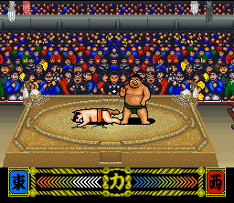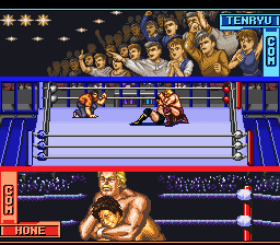 On ne va pas s'étendre très longtemps sur ce jeu de catch puisqu'il s'agit en fait de la version originale japonaise de Hammerlock Wrestling (chose que j'ignorais lors de cette présentation). Genichiro Tenryu fait partie des légendes du catch japonais au même titre que Antonio Inoki ou Giant Baba. Il s'est distingué à la All Japan Pro Wrestling dans les années 80 en faisant équipe avec Jumbo Tsuruta puis en affrontant ce dernier lors d'une rivalité qui a donné certains des meilleurs matches de catch de tous les temps. En occident certains fans le connaissent surtout du fait qu'il soit l'un des rares japonais ayant participé à un Wrestlemania (le 7ème). Il a ensuite formé sa propre fédération, la SWS, qui a malheureusement rapidement fait faillite. Tenryu a cependant rebondi et fondé une seconde fédération, la WAR ("Wrestling And Romance", si si !) qui était en activité lors de la sortie de ce jeu. Pourtant ce dernier ne propose aucun autre catcheur issue de ses rangs : le roster est en effet composé de catcheurs fictifs (fortement inspirés de vraies stars de l'époque) et de Tenryu lui même. En dehors de la page d'intro, le soft est 100% identique à Hammerlock Wrestling, je vous renvoie donc à la critique de ce dernier pour plus d'infos ... Mediocre (si une partie du texte ci dessous vous semble familière, c'est que vous êtes un fidèle lecteur de Grospixels, bravo à vous) Tsuppari Oozumu (Tecmo - 1993)