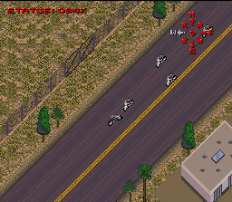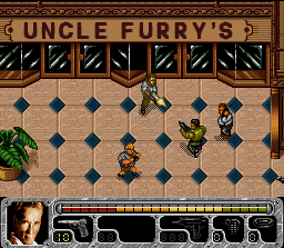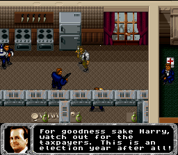 Dans cette adaptation du film de James Cameron, on incarne un agent secret du gouvernement américain, lui-même incarné par Scharzy à l'écran, qui doit mettre fin à une menace terroriste en remplissant diverses missions. Le jeu est un shoot pédestre mâtiné d'un tout petit peu d'exploration, représenté en vue de dessus selon un scrolling multidirectionnel. On doit se frayer un passage l'arme au poing en arrosant de balles les innombrables ennemis, eux aussi lourdement armés, et devant accomplir un objectif comme arriver à un certain endroit ou trouver un objet (rien de bien compliqué de ce coté là). Schwarzy peut tirer dans toutes les directions, "locker" son tir dans une direction particulière en se déplaçant librement, changer d'arme (on trouve des pistolet-mitrailleurs, fusils à pompes ou des grenades, attention les munitions sont limitées) et effectuer une roulade très (trop) pratique pour esquiver les tirs ennemis. Il faut prendre garde à ne pas faire un carton sur les nombreux civils qui arpentent les lieux : 3 d'abattus et on recommence le niveau. Les niveaux sont longs et nombreux et on trouve une séquence spéciale (pas super maniable) dans laquelle on dirige un avion. A première vue, True Lies semble être un bon jeu dans la veine de Chaos Engine (en solo uniquement cependant ici). Les graphismes sont très réussis avec des sprites rondouillards et détaillés qui s'étalent dans une gerbe de sang, et des décors variés (manoir, grand magasin, paysage enneigé ...). Les animations sont correctes, tout comme la maniabilité. La jouabilité est bonne également, on remarque même que les ennemis se mettent parfois à couvert et les civils, bien gênants, nous obligent parfois à attirer les terroristes quelque part pour les descendre tranquillement. Cerise sur le gâteau : le jeu n'est pas dénué d'humour et quand on abat un civil par mégarde, le chef nous rappelle à l'ordre en nous disant qu'il n'est pas très populaire de tuer des innocents alors qu'il est en campagne électorale ! Malheureusement, le jeu souffre également de quelques défauts qui, au final rendent l'expérience pas franchement passionnante. On a déjà un coté un peu répétitif renforcé par la longueur des niveaux et le fait que les ennemis soient souvent toujours les mêmes. Et surtout, il y a le soucis de la roulade. En fait, on s'aperçoit vite que cette dernière nous rend quasi invincible dans de nombreuses situations et permet de finir les niveaux beaucoup plus rapidement qu'en flinguant les ennemis. Et rien n'est là pour dissuader le joueur d'en abuser : ainsi, pas de score à l'écran qui viendrait récompenser un petit massacre en règle par exemple. On sent bien que les développeurs n'ont pas implémenté la roulade dans le game design pour que le joueur s'en serve à tort à travers. Ainsi par exemple, la séquence de fin du 1er niveau nous propose de nous échapper dans une foret enneigée alors qu'on est coursé par tout un tas d'ennemis. Les munitions et médikits disposés régulièrement prouvent qu'on est censés se battre comme un dingue et arriver au bout de la séquence à bout de souffle. Seulement, appuyer continuellement sur le bouton de la roulade, permet de finir le niveau en un rien de temps et sans une égratignure. Bref, il ne manquait à True Lies que quelques petits réglages pour être vraiment bon. En l'état il reste un bon petit défouloir mais son gameplay cassé par la roulade et un peu trop répétitif (Chaos Engine propose par exemple un level design plus varié et efficace) déçoit. Moi j'aime bien quand même. Moyen Et le bon jeu de la semaine : Twisted Tales of Spike Mc Fang / Chou Makai Taisen Dorabo Chan (Red / Naxat / BPS - 1993)