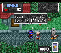 Spike Mc Fang est le nom sous lequel est sorti aux USA le jeu Dorabo Chan, qui est la pseudo-suite de Makai Prince Dorabo Chan, un jeu de plate-forme / action plutôt réussi sur PC Engine. On dirige Spike, le prince d'un royaume attaqué par un voisin un peu trop ambitieux. Il se prend un peu pour Dracula avec sa cape et ses canines proéminentes, mais rassurez-vous, c'est au jus de tomate qu'il carbure, des tomates en effet lui servent de points de vie. Le jeu est vu de dessus, à la manière d'un action-RPG comme Soulblazer ou Legend of Zelda. Spike peut tournoyer sur lui-même pour frapper tout autour de lui ou lancer son chapeau sur ses ennemis. Il doit débarrasser de très vastes niveaux (on aurait bien aimé une carte) de nombreux ennemis et parvenir au boss. Avant de s'engager dans la bataille, il peut visiter des villages pour recueillir des informations et acheter de l'équipement. On trouve de nouveaux chapeaux, plus puissants, mais aussi des cartes à jouer qui donnent en fait des pouvoirs pendant quelques instants (invisibilité, lancer des boules de feu ...). Attention car ces cartes sont distribuées au hasard. Enfin, chaque ennemi vaincu rapporte de l'argent et des points d'expérience pour devenir plus fort et plus résistant. Spike Mc Fang fait énormément penser à Alcahest sorti sur la même machine un an plus tôt. Même représentation et même gameplay basé principalement sur l'action mais avec pas mal d'exploration (cléfs à trouver, personnages à rencontrer). On trouve également de nombreux dialogues et cut-scenes afin de motiver la progression et, surtout, le même système de compagnon dirigé par le CPU qui nous suit à la trace et attaque à nos cotés. La différence ? Le design graphique bien sur, beaucoup plus mignon, et surtout l'humour. Spike Mc Fang est rempli de situations absurdes et de dialogues décalés. Ainsi, dans le 1er niveau, Spike se retrouve face à un bonhomme qui l'envoie valser avec un coup de pied aux fesses qui le fait passer à travers un mur et accéder à la suite du niveau. On trouve également un dialogue qui rappelle les échanges entre Han Solo et Chewbacca quand Spike interprète les grognements de son copain le monstre-batracien comme des informations très précises. Bien réalisé, jouable, pas trop difficile et vraiment attachant, Spike Mc Fang est un très bon jeu, malheureusement peu connu, que je vous recommande chaudement. David consacre un article à la version japonaise ici : http://grospixels.com/site/dorachan.php Bien Et Bonne Année 2013 à tous !