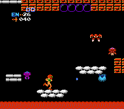 Ca me fait penser à Kid Icarus: le début est dur, mais alors après la difficulté diminue progressivement au fur et à mesure que le héros (ou l'héroïne) gagne des capacités et devient une machine de guerre. En plus, il y a plein de moments dans ce Metroid où il faut sauter de plate-forme en plate-forme pour monter tout en haut de puits interminables, et donc ça me rappelle Kid Icarus. Idem pour quelques phases horizontales de plate-forme qu'on peut trouver dans les deux jeux. Et puis même certaines musiques me font un peu penser à Kid Icarus. Bon, normal vu que Gunpei Yokoi est derrière les deux jeux (avec la même équipe de développement et le même moteur) sortis avec quelques mois d'écart, et c'est Hirokazu Tanaka qui a composé les musiques de Metroid 1 et Kid Icarus (ainsi que de Mother 1 au passage). J'en profite d'ailleurs pour dire que j'aime beaucoup les musiques de ce jeu, à savoir l'intro bien connue et souvent reprise, le fameux thème du premier niveau (Brinstar), et surtout la musique de la zone de Kraid qui est ma préférée pour l'instant (et que je ne connaissais pas du tout jusqu'à maintenant, donc elle n'a jamais dû être remixée sauf dans Zero Mission). Pas étonnant si l'on trouve beaucoup de similitudes entre les deux jeux donc.