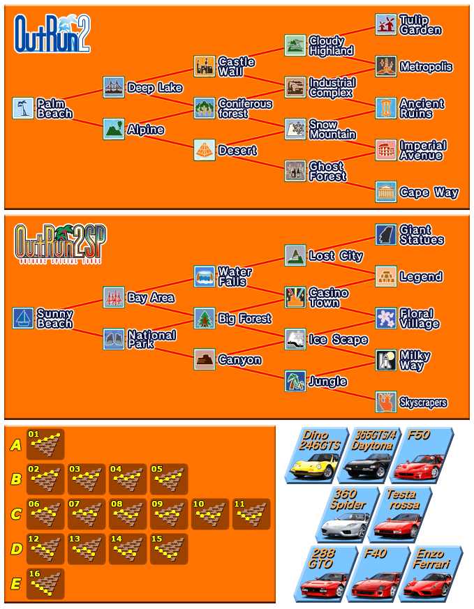Par contre je suis sur hélas qu'il n'y a pas les 2 courses cachées tirées de Daytona 2 et Scud Race. Je crois qu'elles ne sont vraiment que dans la version Xbox de Outrun 2 (PAS Outrun 2006).