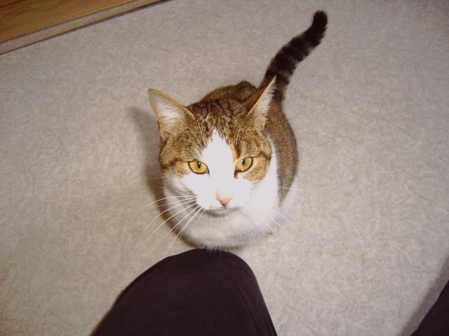 Le lendemain matin, je pars bosser, j'ouvre la porte et, qu'est-ce que je vois juste devant, me regardant avec ses grands yeux ? Le chien de chasse ? Mais non, le ptit chat voyons, vous suivez pas là. Bon, j'ai un peu de temps devant moi, alors je le laisse rentrer (il se fait pas prier) et je lui donne un peu de lait dans une assiète, comme j'ai vu faire dans les dessin-animés (j'ai jamais eu de chat avant). Le chat n'en a rien à battre du lait mais se plait bien dans l'appart (l'est bien le seul ...). On échange quelques caresses/calins histoire de mieux se connaitre, puis je le fous dehors, parce que je dois aller bosser hein, et je laisse jamais des inconnus seuls chez moi, même si on a fait des calins avant. Le truc marrant / mignon / flippant, c'est que le chat se révelle immédiatement être un "stalker". Il me suit fidèlement comme un petit chien dans la rue, marche à coté de moi, s'arrête quand je m'arrête ... etc ...