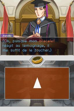 Reste cependant une dernière nouveauté. Tout comme Wright avait le Magatama, Apollo a quant à lui un bracelet magique qui lui permet de repérer au cours d'un témoignage lors d'une session au tribunal les signes de nervosité de celui qui parle. Si jamais Apollo pressent quelque chose, une icône bracelet se met à briller sur l'écran tactile ; une fois sélectionnée, un « zoom » du témoin apparaît alors tandis que sa phrase défile lentement. À vous alors de repérer les petits tics qui se manifestent quand un certain bout de son témoignage est prononcée : une veine qui grossit, une sudation étrange, une envie de se gratter au cou... Cela permet à Apollo d'effectuer une « pression supplémentaire » sur le témoin et, de là, à y voir plus clair dans son jeu.