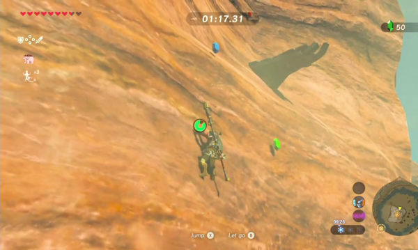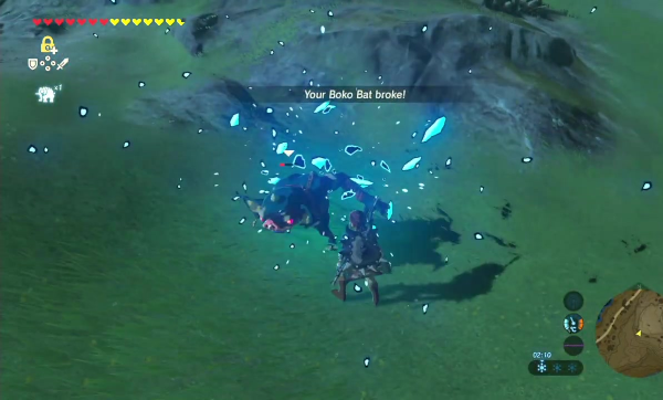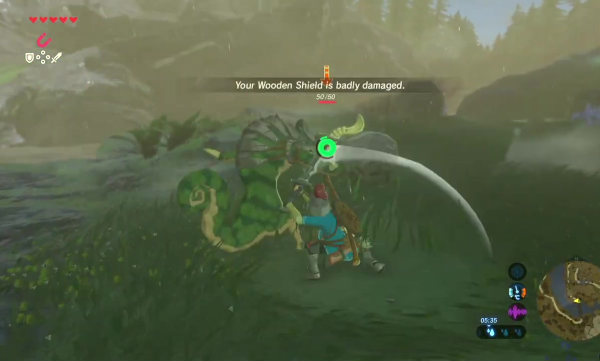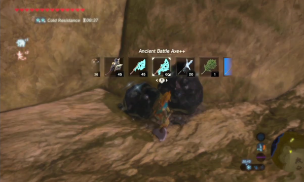 En ce sens, et même si on rouspète souvent en début de partie, on finit par s'accomoder de ce principe. Il nous invite à toujours aller de l'avant et à toujours chercher le prochain ennemi, la prochaine cachette, il nous invite à employer une diversité d'approches pour vaincre les adversaires là où il est facile, dans d'autres jeux d'aventure, de se restreindre à une arme particulière qui ne nous quittera plus le long de la partie. Des dires des développeurs, ce choix a été précisément fait pour nous inciter à profiter du système de combat complexe qu'ils avaient mis en place et malgré les discussions, nombreuses, le concernant, et malgré l'obscurité de son fonctionnement, on apprend à le tolérer, sinon à l'apprécier, et c'était de loin la meilleure des solutions. Il est vrai en revanche qu'obtenir l'épée de légende, qui nous demande d'avoir un certain nombre de cœurs de vie et, partant, d'avoir fini quelques bêtes divines ou quelques sanctuaires, nous soulage assez, comme on a l'assurance d'avoir toujours sur soi une arme de secours. À terme, elle servira notamment pour briser les gisements rocheux offrant de rares pierres précieuses, fort utiles pour améliorer ses vêtements et remplir sa bourse de rubis, sans risquer d'abîmer une arme bien plus puissante qui serait utile ailleurs.