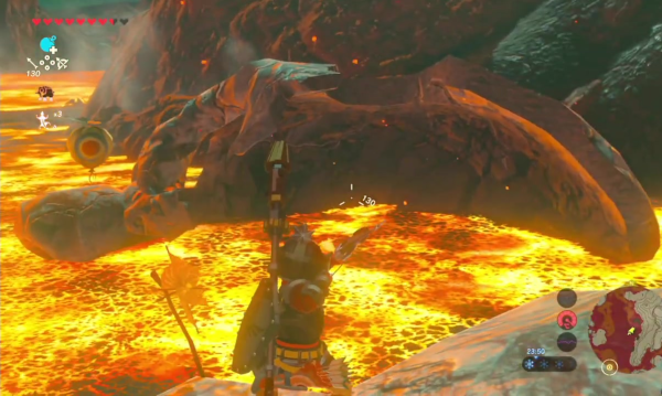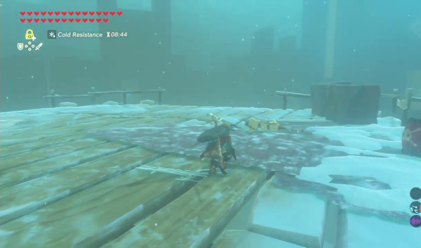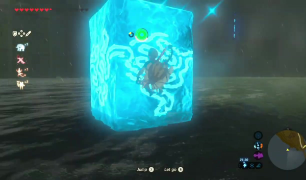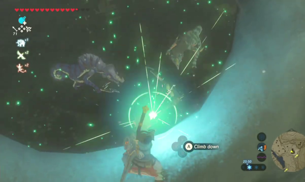 Comme on l'a compris au fur et à mesure de la lecture de cet article, évoquer un élément de jeu, c'est, nécessairement, devoir parler de tous les autres comme ils se répondent, s'ajoutent et se renforcent. Cet effet cascadant est déterminant et il faut le comprendre pour apprécier à sa juste valeur tout ce que l'épisode sait faire, et sa philosophie générale de proposer un monde ouvert mais surtout cohérent, où les règles trouvent à s'appliquer constamment, sans exception aucune. Laissez-moi donner, encore, quelques exemples. Certaines énigmes demandent, ainsi, de faire circuler un courant électrique d'une borne à un récepteur, et tout semble nous indiquer une certaine résolution, déplacer des cubes de métal avec Polaris ou activer des interrupteurs pour guider le courant ; mais on peut aussi créer une chaîne avec nos armes, nos boucliers et nos arcs de métal pour ce faire, ou simplement tirer une flèche électrique vers l'objectif. Si l'on a sur soi une épée de flammes, nul besoin d'une préparation réchauffante ou d'habits fourrés, sa chaleur nous permettra de résister aux montagnes givrées. Dans le volcan, il suffit simplement d'utiliser une flèche de bois pour la voir s'enflammer naturellement, tandis que les flèches de glace fondent avant même qu'on ne les décoche. Elles peuvent aussi créer des plates-formes de glace pour nous permettre de traverser les rivières sans mal aucun, si jamais Cryonis ne nous convenait pas.