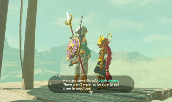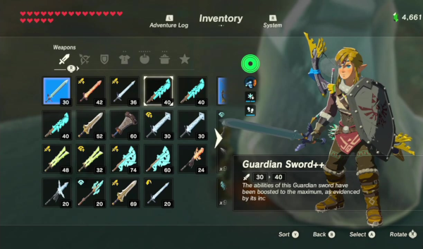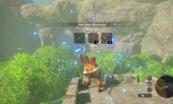 Aux côtés des habits, des matériaux et des plats, notre écran d'inventaire nous propose plusieurs autres onglets. Outre les objets spéciaux, liés généralement à la quête principale de l'aventure, on trouvera la liste des arcs et des flèches, des armes et des boucliers que nous avons obtenus. Ces éléments ne sont pas, comme jadis, uniques et magiques, pas particulièrement tout du moins et exception faite de l'épée de légende que nous pouvons récupérer à un moment donné de l'aventure mais, là encore, sans aucune obligation. Ce sont simplement des équipements que nous récupérons sur les corps des ennemis, dans des coffres ou des ruines. On en trouvera beaucoup, et leur variété est impressionnante, mais on ne peut faire autrement : car toutes les armes que nous trouverons se briseront tôt ou tard. De la petite branche d'arbre à l'espadon royal en passant par les arcs de métal, les boomerangs ou les boucliers d'or et de joyaux, tout cet équipement s'use et finira par se briser au bout d'un certain nombre de coups donnés ou reçus, nous laissant dans la nécessité de trouver rapidement un remplaçant sous peine de ne pouvoir attaquer. Même l'épée de légende, au bout d'un moment, devra se « recharger » de son énergie mystique pendant une dizaine de minutes, même si elle ne quittera jamais notre inventaire.