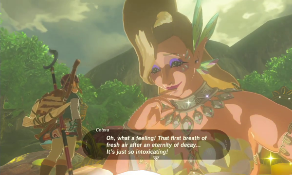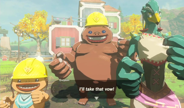 Une fois encore, le soin du détail et l'intérêt porté à ces petits moments insignifiants participent grandement au charme de l'aventure, et on continue encore à trouver des petites choses séduisantes que les développeurs ont pensé à inclure. Certains personnages sont restés dans les mémoires, comme on les apprécie et qu'ils sont délurés : Pru'Ha est une scientifique centenaire qu'une expérience malheureuse a fait rajeunir à ses six ans ; Riju est la chef des Gerudos, et compense sa petite stature par une férocité inégalable au combat. Même les seconds couteaux, et ils sont nombreux comme il y a plus d'une centaine de personnages nommés individuellement dans l'aventure, ont leur petit trait de personnalité, leur caractère et leur histoire, même si petitement développé, entre le passionné des sources chaudes, le curieux de la paravoile ou la commerçante qui cherche à agrandir sa boutique. Trois personnages, cependant, ont tiré leur épingle du jeu et sont devenus des favoris. Le premier est Grosaillieh, un artisan qui bosse sans traînailler et qui sera au cœur de l'une des quêtes les plus longues du jeu. Il souhaite effectivement construire son propre village, Euzero, et nous demande tant de l'aider à construire des baraques qu'à faire venir des habitants et habitantes intéressées à changer de vie. Il y a une contrainte particulière cependant : il faut que leur nom se finisse par « -ieh » pour correspondre au motto de son entreprise. Alors, à vous de souvenir où se trouvent Shantieh, Kornueih, Pervieh et Klavieh, en espérant que vous ayez prêté attention jadis à leur nom.