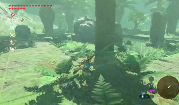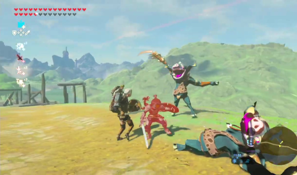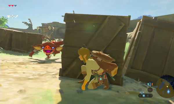 Car le jeu est beau, incroyablement beau. Son style graphique persiste dans la direction initée par Skyward Sword, et qui demeurait sa meilleure réussite : à un dessin plutôt réaliste et détaillé s'ajoute une passe de cel-shading du meilleur effet qui augmente les contrastes et rend les couleurs particulières éclatantes. Le travail sur la lumière bénéficie notablement de ces effets, et il suffit d'attendre près d'une source de chaleur, d'un feu ou d'un incendie, ou encore de laisser la lumière ou du jour décliner tranquillement, pour voir tout un nuancier se transformer sous nos yeux ravis. C'est cependant l'animation, et ses détails, que je retiendrai le plus ici. Link, tout d'abord, est criant de vie : il peine en escaladant des murs raides, grelotte de froid ou souffre de la chaleur caniculaire, est ravi en cuisinant. Mais tous les personnages réagissent à nos actions et au monde autour d'eux : ils se plaignent de la pluie et courent se mettre à l'abri si besoin, se mettent en garde ou se protègent quand nous utilisons une épée près d'eux, commentent notre tenue ou notre équipement. Les ennemis ne sont pas en reste : ils hurlent agressivement lorsqu'ils nous touchent, se gênent et s'organisent, certains géants balancent leurs petits camarades sur nous s'ils ne trouvent pas d'armes à leur goût.
