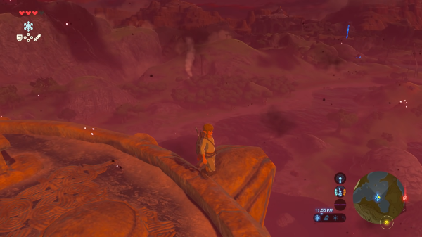 Si ce principe est assez bien rendu, et s'il est toujours un plaisir de découvrir une nouvelle tunique ou un nouveau chapeau (surtout que leur dessin est toujours très réussi), il implique hélas souvent des aller-retours plus ou moins réguliers dans l'inventaire pour adapter notre tenue à la situation de jeu. Il est malheureux que le jeu ne propose point d'options permettant d'enregistrer, comme favorite, une certaine combinaison, afin d'y retourner plus rapidement. Il est vrai que ce problème se rencontre peu en début de partie, comme on reste souvent longtemps qui dans le désert, qui dans les montagnes ou le volcan pour les cartographier, mais lorsque nous sautillons de Sanctuaire en Sanctuaire pour trouver les ultimes secrets, la chose en devient d'autant plus fastidieuse. Fort heureusement, accéder à notre inventaire immobilise parfaitement la situation de jeu et nous permet ainsi de prendre tout notre temps pour ces préparatifs et ce à l'encontre d'un Dark Souls, par exemple. Cela nous permet aussi de nous soigner intégralement au cours d'un combat, voire de foncer directement vers la boutique des Gorons ou des Piafs en se goinfrant de plats revitalisants pour acheter la protection idoine et sans se soucier de préparer un remède à base de piments ou d'herbes gelées. Une fois encore, on ne peut qu'apprécier la diversité des approches proposées et même si le jeu nous invite assez explicitement à jouer élégamment, je me suis jadis brûlé les pattes en courant comme un dératé et en m'empriffrant régulièrement pour acheter l'armure de pierre lors de ma toute première visite de la Montagne de la Mort, ce qui demeure l'un des exploits dont je suis le plus fier, et dont j'ai aussi le plus honte.