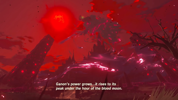 Les lunes de sang sont annoncées par une musique inquiétante, de la brume noire et cette couleur rouge. Elles surviennent toutes les trois heures de jeu, ce qui représente environ une semaine dans l'univers, mais ne se déclencheront pas dans les Bêtes divines ou dans le château d'Hyrule.