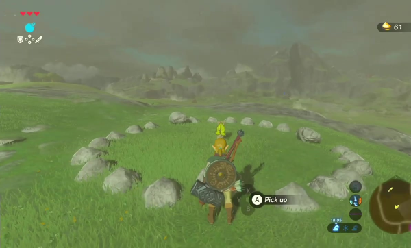 Nous commençons effectivement avec un nombre limité d'emplacements au début de la partie. Pour augmenter la taille de notre sacoche, il faudra trouver dans le monde, et rapporter à un personnage que l'on croise la première fois à Cocorico, des noix de Korogus. Ce sont des récompenses obtenues en débusquant dans la nature des créatures des bois, qui se planquent un peu partout : sous des cailloux curieusement isolés au sommet de petites collines, sous la forme de lumières magiques errant autour de bosquets curieux, parfois en résolvant une petite énigme. Ces créatures sont nombreuses : lors de ma première partie, j'en avais trouvé, naturellement, environ soixante-dix, rien qu'en me laissant guider par la curiosité. Pour peu qu'on soit attentif, et que l'on prenne le temps d'aller ci et là comme on n'a pas d'objectifs précis, on les trouvera plutôt facilement. Rien qu'avec ce pécule, il est possible de doubler le nombre d'emplacements de notre inventaire et de finir tranquillement l'aventure, sans se soucier de la durabilité de nos armes. Mais si vous le voulez vraiment, sachez qu'il y a près de 900 noix à trouver dans l'univers, bien plus qu'on en aura effectivement besoin. Cette quête ultime, assimilable à celle des Skulltulas d'or d'Ocarina of Time, est devenue notoire tant elle est fastidieuse. Le gain, cependant, est inutile mais satisfera celles et ceux qui, comme moi, aiment à tout voir, tout explorer et tout obtenir.
