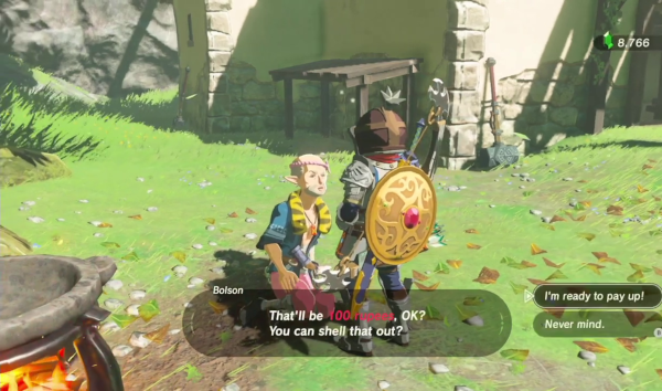 Une autre nouveauté frappante de BotW au regard de ses prédécesseurs est la façon dont il gère les ressources historiques de la série, soit les cœurs de vie, l'argent, les épées, les arcs et les boucliers, en s'inspirant davantage de ce qui se faisait dans les jeux de rôles à la Skyrim ou à la Dark Souls, quelque part. Pour qui était habitué aux systèmes précédents, cela participe énormément à la difficulté initiale du jeu et, pour certaines de ces décisions tout du moins, ces choix cristallisent la critique la plus forte qu'on lui a faite. Dès le début de l'aventure, on remarquera rapidement que les fourrés ou les ennemis ne laissent point, comme à l'ordinaire, des cœurs de vie ou de l'argent. Si on peut éventuellement trouver des rubis sous certains pots ou dans des caisses, le pécule sera des plus limités. En revanche, on trouvera en abondance dans la nature des fruits, des champignons et des herbes, et les ennemis laissent à leur mort, outre leur équipement, des matériaux divers, des canines, des ailes, des yeux voire, qui rejoindront notre inventaire.