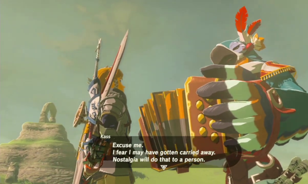 Je peux encore parler des épreuves des Sanctuaires elles-mêmes, ou des quêtes annexes les débloquant et nous demandant de résoudre une petite énigme à la surface, délivrée sous la forme d'un poème offert par un Piaf au bandonéon et que l'on croise ci et là ; de leur ingéniosité et de leur roublardise souvent, et de la satisfaction de trouver la solution après avoir cogité plusieurs minutes. Je peux parler des duels tendus face aux Lynels, qui sont de belles joutes longues de plusieurs minutes, qui mettront en jeu nos capacités d'esquive et de combat. Je peux parler de l'encyclopédie à compléter, en photographiant tous les ennemis, monstres et armes du jeu, et qui permet de bénéficier d'un détecteur fort utile une fois atteint un certain point de l'aventure. Il y aussi les références nombreuses aux anciens jeux, de l'arbre Mojo qui garde l'épée sacrée aux sources de Courage, de Force et de Sagesse, très bien cachée dans le monde et qui nous demandent d'aider des dragons géants corrompus par les forces du mal, en passant par le bouclier hylien bien gardé dans le château d'Hyrule. Je pourrais évoquer le fait d'attirer à nous les animaux et les chevaux avec de la nourriture, et de se faire ainsi l'ami des chiens que l'on croise souvent et qui, s'ils sont contents, nous conduisent à des trésors enfouis. Je pourrais enfin évoquer les histoires cachées des villageoises et des villageois, qui vivent leur petite vie, ont leurs secrets et leur emploi du temps, et qui réagissent progressivement à nos hauts faits.