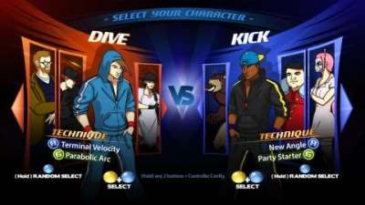 Derrière ses blagues potaches et ses nombreuses références à l'univers du jeu de combat compétitif, Divekick est une véritable déconstruction du genre, poussant le vice jusqu'à ne se jouer qu'à deux boutons : Dive et Kick. Aucune direction, aucun autre bouton, vous n'avez qu'un bouton pour sauter et un autre pour frapper. Le plus fort est que le jeu se révèle incroyablement varié, utilisant des variations parfois minimes dans les trajectoires de saut et de frappe pour différencier les personnages. Dive vous permet de sauter, et Kick de frapper une fois en l'air ; si vous êtes au sol, Kick vous fait sauter en arrière. Vous avez aussi deux coups spéciaux, utilisables une fois que la jauge de puissance est suffisamment remplie, et qui s'effectuent avec les deux boutons en même temps. Divekick revient aux sources de ce qui fait du jeu de combat un genre si addictif, à savoir la maîtrise des positions et la manipulation mentale. C'est une véritable guerre de positions qui se livre à coups de feintes, de sauts et de petites avancées effectuées en rase-mottes, le tout en accord avec les trajectoires de son propre personnage. Un jeu très simple et à la fois très complexe qui, s'il ne vous repousse pas par son visuel peu attrayant et son humour d'initié, a toutes les chances de vous plaire.