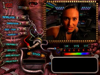 Du déjà vu...Si ce style de programme est maintenant parfaitement maîtrisé, il faut bien reconnaître que l'interaction se limite le plus souvent à l'appui d'un bouton à un moment précis. Cependant, grâce à l'interface développée, les actions à effectuer sont ici bien plus nombreuses : répondre aux questions, analyser, stocker des données, activer votre bras, éclairer, communiquer grâce à un code de couleurs, activer votre sonde et enfin, diagnostiquer et lancer cette dernière. ![]() Pour enfoncer le clou, il vous faut encore diriger votre sonde dans de tortueux labyrinthes ou la placer de manière à accéder à certains endroits dans le but de vous accaparer de singuliers objets. Les développeurs auraient pu s'en tenir à ce panel déjà bien éclectique mais, pour notre plus grand bonheur, ils ne s'arrêtèrent pas là. Des énigmes, rappelant immanquablement le célèbre 7th Guest, ont donc été disséminées tout au long de l'aventure. On peut penser que ces dernières ne sont placées que pour allonger artificiellement la durée de vie mais il n'en est rien, leur mise en place se faisant de manière très cohérente. Ajoutons à tout cela l'une ou l'autre scène de tir et attaquons sans plus tarder la réalisation. ![]() ![]()