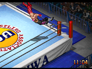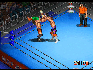 Techniquement, c'est exactement le même moteur de jeu que celui utilisé sur Saturn, et qui est déjà en soi une amélioration du dernier épisode Super Famicom, qui est repris. Sauf que le résultat est un peu plus terne. Les sprites sont aussi détaillés mais les couleurs moins éclatantes et les animations un peu moins fluides. Enfin, il faut vraiment avoir les 2 jeux tournant l'un à coté de l'autre pour remarquer ces différences mais c'est un fait : la version Saturn est plus jolie. Ce qui est plus voyant en revanche, hélas, c'est l'absence de mode 6 joueurs. Les matches en équipe, tout comme les batailles royales, sont limités à 4 catcheurs sur le ring uniquement, voilà qui est bien dommage.