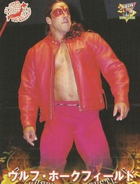 Le personnage de Wolf Hawkfield provient du jeu vidéo de Sega Virtua Fighter. On avait déjà vu des catcheurs basés sur des héros de manga ou d'anime (Tiger Mask...) mais c'est à ma connaissance la premiere fois qu'un catcheur est tiré d'un jeu vidéo. Évoluant à la AJPW à la fin des années 90, il est vraissemblablement né pour assurer la promotion du jeu d'arcade Giant Gram (adapté sur Dreamcast) de Sega qui dispose de la licence de cette fédération. Le personnage est incarné par l'américain Jim Steele. Malgré son impact assez faible sur le monde du puroresu, on ne pouvait pas ne pas parler de lui sur Grospixels !