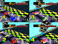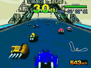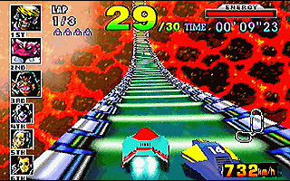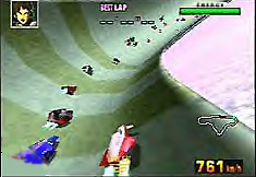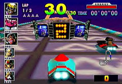 1998 - F-Zero X (Nintendo 64)Enfin une vraie suite ! Parce qu'entre l'épisode annulé sur Virtual Boy et l'épisode Satellaview, très ciblé géographiquement, nous n'avions pas grand chose à nous mettre sous la dent depuis... des années entières ! En 8 ans les développeurs de Nintendo ont jugé que les progrès aérotechniques ont sérieusement accéléré. Du coup, si on en croit le livret, cet épisode se déroule dans pas longtemps : au XXIIème siècles seulement (soit quelques 400 ans avant le premier !). ![]() ![]() Démarrons par une nouveauté qui s'est faite attendre : dans ce futur, nettement plus proche, on a enfin droit à un mode multijoueur, et Nintendo 64 oblige, jusqu'à 4 joueurs peuvent s'affronter sur un même écran. Puisque nous y sommes, évoquons les autres modes de jeu. Passons rapidement sur les plus classiques : En plus de ce nouveau mode Multijoueur, nous avons un Championnat évidemment, un Time Attack comme il se doit, des menus Option et Records, la moindre des politesses... Ajoutons le Training, une petite nouveauté de cet opus, qui consiste à sélectionner n'importe quelle course pour tourner, tourner, et tourner encore, sur celle-ci. Ce mode ne connaît pas de fin, si ce n'est la lassitude du joueur, il permet simplement aux plus consciencieux de bien s'entraîner avant la bataille. Enfin pour clore le défilé de "modes", un petit dernier pour la route, et sans conteste le plus original d'entre tous : le Death Race. C'est une sorte de mode "Survival" où il faut savoir jouer des coudes et pousser tous les autres dans le vide, pour finir seul, dernier survivant de la piste. Mais pourquoi tant de cruauté avec nos petits compagnons ? Peut-être un début d'explication : parce qu'il y en a plein ! ![]() ![]() Et oui, hormis la 3D, c'est sans doute la plus grosse innovation du jeu : sur N64, l'enfer c'est les bots. Aux oubliettes les quatre pauvres personnages qui se tiraient la bourre en comité presque restreint. Aux oubliettes, aussi, les huit véhicules d'abord annoncés dans la presse fin 1997. D'ailleurs, Miyamoto - qui reste plus que jamais aux commandes - a confié que l'intelligence artificielle des vaisseaux avait pris huit mois à une division d'EAD. Ces talentueux programmeurs possédaient pourtant une solide expérience des simulations de courses en 3D. Ce sont eux qui, en grande partie, venaient de développer (en 1996) Wave Race, une autre course à la maniabilité très atypique, puisqu'il s'agit d'une simulation de Jet Ski extrêmement réussie. Mais l'expérience n'empêchant pas les retards, gérer un troupeau d'hovercrafts n'est pas une mince affaire, et cette composante du jeu méritait, sans doute, ce délai là. Surtout au vu du résultat : huit mois d'études, d'essais, de changements, sont pleinement justifiés quand il s'agit de faire interagir une véritable masse de concurrents. L'objectif avoué était de présenter, simultanément, suffisamment d'adversaires à l'écran pour créer une impression presque organique. Et c'est totalement réussi puisqu'ils nous offrent un flot toujours vif et fluide de... trente véhicules ! Oui 30 véhicules : vingt-neuf à combattre, le trentième est entre nos phalanges, encore faut-il trouver la machine qui nous convienne. Au départ, seuls six vaisseaux sont disponibles, le reste du garage se débloque au fur et à mesure de nos succès. Le choix parait alors énorme mais, à l'usage, on finit par trouver plein de véhicules équivalents. Forcément trente... Si les vaisseaux sont équivalents sur le terrain, ce n'est pas du tout le cas du look de leur pilote. Takaya Imamura, l'un des designers à l'origine des personnages de la série sur SuperNES, a repris alors du service pour créer autant de nouveaux bonshommes qu'il y a de nouveaux engins, et tous ont une dégaine bien à eux. Comme avant, leurs machines respectives sont plus ou moins fragiles. Elles peuvent toujours récupérer leur énergie vitale en passant sur les zones roses mais le concept a évolué. Le système "d'un Super Jet par tour accompli" a été abandonné. Maintenant, Nintendo met tout dans le même panier et la jauge d'énergie devient aussi, dès le deuxième tour, le réservoir de boosts. C'est peut-être un détail pour vous, mais quand on roule ça veut dire beaucoup : encore plus libre qu'avant, si on ne rentre pas trop dans les murs et si on sait un peu gérer tout ça, c'est beaucoup plus d'un boost par round qui s'offre à nous. Ce nouveau principe nous permet de - ou plutôt nous oblige à - 'foncer' en permanence ...au détriment de notre bouclier, celui s'amenuisant un peu plus à chaque impulsion. Mais les autres concurrents nous tiennent la dragée haute et pour rester en tête du peloton, nous n'avons guère le choix, il faut booster. Et tant pis si nous terminons chaque course à la limite de l'explosion. Ou plutôt tant mieux, cela offre encore une touche de fun supplémentaire. Et c'est vraiment le fun qui restera de cette course folle. C'est la division appelée parfois Team Star Fox (à l'origine du jeu homonyme, version 64) qui s'est chargé de programmer ces lacets insensés. Au départ, il y a trois championnats de six parcours plus dingues les uns que les autres, ce qui est, déjà, énorme. Mais quand on vient parfaitement à bout de ces premières compétitions, c'est un quatrième championnat, encore plus dément, quis'ajoute à la liste, le Joker Cup. Remportons également, puisqu'aujourd'hui nous sommes en forme, le Joker Cup et voilà qu'un cinquième championnat pointe le bout de son nez. Celui-ci propose, pour faire son intéressant, des circuits aux tracés aléatoires. "Génial, on a jamais deux fois le même tracés, cela offre une infinité de courses différentes" se dit-on songeur. C'est toute la différence entre la théorie et la pratique. A l'usage, ces circuits "random" finissent par tous se ressembler, ils n'ont pas les loopings et la folie des circuits précalculés. D