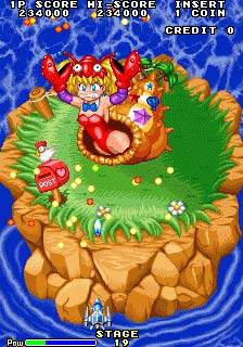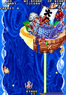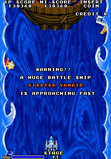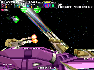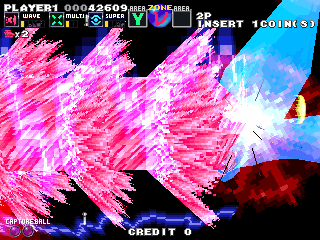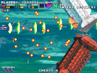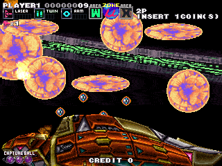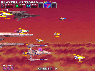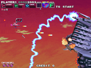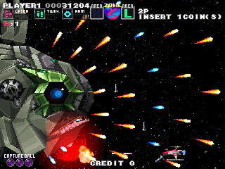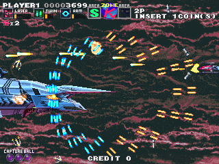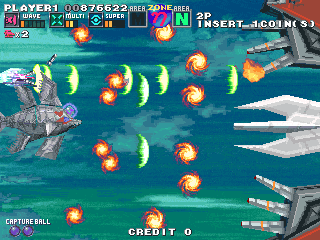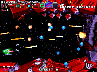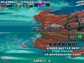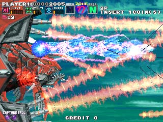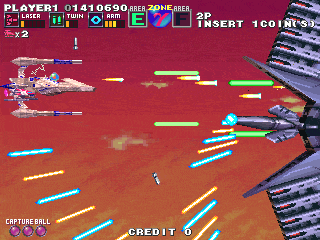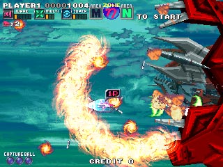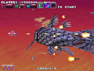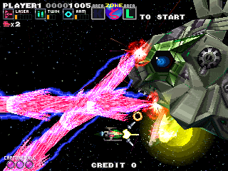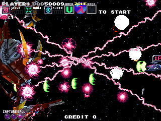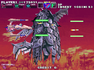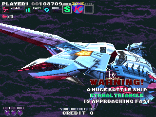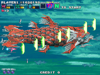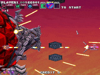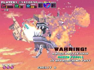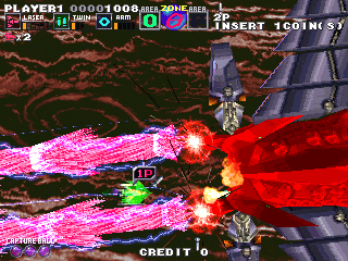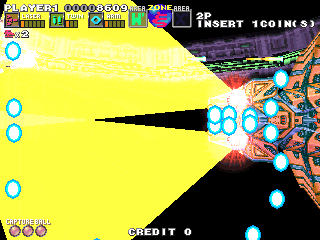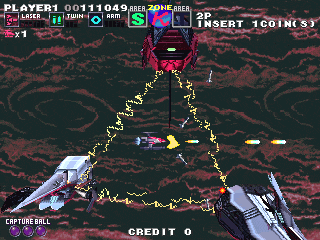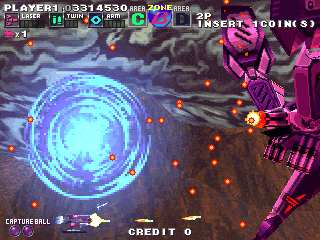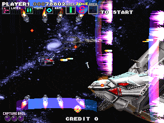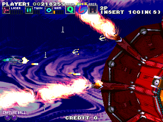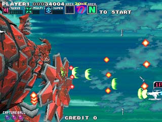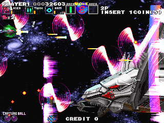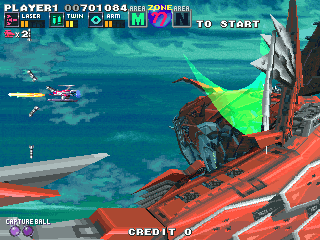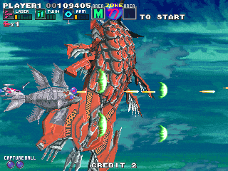 C'est avec G-Darius qu'on se dit que, finalement, le bestiaire maritime n'était pas une idée si folle que ça. Quiconque regarde quelques minutes un bel aquarium ou un documentaire sur les fonds marins verra dans le déplacement des poissons une souplesse princière et une grâce infinie. Les monstres de G-Darius ont beau être vindicatifs, leurs mouvements gardent cette même élégance. Et ça, seule la 3D le permet. On sent que les graphistes ont passé du temps à faire bouger virtuellement leurs créatures avant même de les doter d'un arsenal. C'est avec le Queen Fossil et le Fire Fossil que ce travail est le plus apparent. Ces deux boss géants font des vrilles, des pirouettes, perçant les nuages comme s'ils bondissaient hors de l'océan, comme le ferait un véritable poisson. Le Dimension Diver utilise lui aussi l'espace avec classe. Comme son nom l'indique, cette créature se sert des failles dimensionnelles pour prendre des raccourcis, ce qui fait qu'on retrouve deux parties de son corps à deux endroits ou sur deux plans différents. On peut aussi mentionner le Dual Horn, un homard très agité qui vous fonce dessus à plusieurs reprises, se recroqueville et tourne sur lui-même en parcourant tout l'écran, puis finit son show en vous encerclant de toute sa longueur. ![]() ![]() ![]() ![]() En regardant ces affrontements marathons et le nombre incroyable d'acrobaties dont est capable l'ennemi, on ne peut que penser à Radiant Silvergun, autre « shoot à boss », dont la grandeur visuelle repose tout autant sur le même genre de spectacle. Il n'est pas impossible, bien que les deux jeux n'aient qu'un an d'écart, que Treasure soit allé pêcher quelques idées dans G-Darius. Difficile de citer des éléments précis, car prendre des idées chez les collègues et les inclure telles quelles dans leurs jeux est bien la dernière chose que les développeurs Treasure oseraient faire, habitués qu'ils sont à tout remanier à leur sauce. Il y a quand même des signes : la technique de « confinement » utilisée par l'Eternal Triangle, un espadon qui se divise en trois (autre excellente idée), fait penser au module rotatif du stage 2C de Radiant. Les balles rebondissantes du Dual Horn évoquent le boss 17VA-50 du stage 4B ou encore le Daikaiten du stage 2D. On peut également comparer les lames en rotation que le Queen Fossil et le Fire Fossil envoient avec leur nageoire et les attaques « fauchantes » du fabuleux Penta (stage 4D). Au-delà de ces rapprochements, qui ne peuvent être que pure spéculation, il y a bien un point commun entre les deux titres plan de la démarche : une volonté de pousser la phase de boss dans les limites du concept, loin au-dessus de la masse des autres shoots, devenus tellement modestes en comparaison. ![]() ![]() ![]() ![]() Un mot sur les deux boss un peu à part que sont le Queen Fossil et le Fire Fossil. Ces deux gigantesques poissons succèdent en quelque sorte au Titanic Lance de Darius Gaiden. Deux boss forteresses en apparence très proches (même graphisme à part la couleur, mêmes acrobaties) mais ayant chacun leurs propres armes. Le Queen Fossil se rencontre à la deuxième zone et le Fire Fossil à la quatrième, ce qui change également la difficulté du tout au tout. Ils apparaissent dans le niveau très tôt, au moment où vous devez choisir votre itinéraire interne (choix qui comme d'habitude modifiera en partie leur comportement) et, comme vous vous en doutez, on passe un temps particulièrement long à les affronter. Ce sont eux qui détiennent le record du nombre d'attaques, plusieurs dizaines chacun. La moindre partie de leur corps cache une arme, ils peuvent envoyer leurs écailles, s'en servir comme bouclier ou encore s'éloigner à l'horizon pour mieux vous viser avec une salve de missiles. Etant donné la longueur de ces séquences, un mini-boss vous est « offert » vers le milieu de l'affrontement. Le combat pour en prendre le contrôle est volontairement aisé, puisque aucun autre danger ne vient l'interrompre. ![]() ![]() ![]() ![]() ![]() ![]() Ce cadeau au joueur n'est pas fait par hasard, puisque ces deux boss offrent l'opportunité la plus nette pour sortir un quadruple alpha beam. Tard dans la séquence, ils se mettent de côté et envoient plusieurs beta beam de suite. C'est LE moment pour saisir sa chance. On y arrive assez vite contre le Queen Fossil, qui fait un peu office de tutorial puisqu'il n'est nul besoin de marteler le bouton à en perdre haleine pour gagner les duels. Face au Fire Fossil, en revanche... C'est aussi contre ce dernier qu'on subit certaines des attaques les plus fourbes du jeu : un lance-flamme à faire une dépression, qui par la suite se tord pour vous enfermer dans un espace restreint, ou d'ignobles traînées de feu qui réduisent une à une vos options de fuite. Les deux Fossil sont des moments clés de G-Darius, des séquences où les développeurs de Taito sont allés au bout de leur logique et qui justifient à elles seules de connaître le jeu. On pourrait encore en raconter beaucoup sur les boss, sur les décharges foudroyantes du Lightning Coronatus, les batteries de lasers du G.T (Great Thing), les réacteurs du Death Wing ou le déplacement majestueux du Eight Feet Umbrella, mais on n'en sortirait pas. Mieux vaut découvrir tout cela soi-même. Deux choses, pour terminer sur ce chapitre : certains boss sont évidemment des abonnés à la série (G.T, Heavy Arms Shell, Death Wing...) et sur PS, tous sont un peu plus résistants qu'en arcade. ![]() ![]() ![]() ![]() ![]() ![]() Pour terminer, un aperçu des attaques des autres boss, parmi les plus impressionnantes et difficiles à esquiver : ![]() ![]() ![]() ![]() ![]() ![]() ![]() ![]() ![]() ![]() ![]() ![]() Chapeau bas, Taito.De quoi peut-on encore parler pour compléter le tableau ? Des fins peut-être ? Quelques cut scenes succinctes, étranges ou elliptiques. Elles sont, comme toujours dans la série, différentes sel