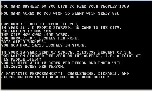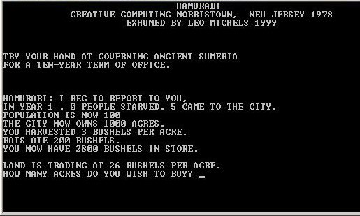 L'ancêtre des jeux de stratégie et de simulationsHamurabi (parfois appelé aussi Kingdom) est un jeu qui n'évoquera probablement aucun souvenir pour les joueurs âgés de moins de 30 ans (et pour cause, il fut conçu par David Ahl aux débuts des années 1970)... mais c'est un événement majeur dans l'histoire des jeux vidéos ! ![]() Revenons aux sources, en cette époque glorieuse époque qui avait déjà vu l'apparition des premiers jeux sur les "mainframes computers", notamment SpaceWar et Trek, et qui verrait vers la fin de la décennie les premiers micro-ordinateurs (Apple par exemple en 1977), un ovni ludique prenait la forme d'un programme BASIC d'une cinquantaine de lignes... Présenté par David Ahl dans son livre "Basic Computer Games" il allait donner naissance à tout un nouveau pan de l'univers ludique. ![]() A l'appel de votre chambellan, vous décidez de prendre la destinée du royaume de Sumérie en main : ![]() Le principe est révolutionnaire : Vous incarnez Hamurabi, le grand roi de Sumérie, et vous devez administrer votre royaume pour une durée de 10 ans... Charge à vous, donc, d'arbitrer tous les ans (la notion de tour de jeu apparaît) entre la plantation d'hectares de blé, d'achat ou de ventre des terres aux royaumes voisins... sans oublier de remplir certains silos pour alimenter votre peuple... ![]() Dans un environnement des plus spartiate (tout le jeu se présente sous la forme d'un dialogue en format texte entre vous et votre chambellan), on se pique à s'essayer de jouer ... à Dieu ! En fonction de vos réponses, des gens vous mourir, votre peuple va s'enrichir ou au contraire sombrer dans la décadence ... Agissez en monarque éclairé, votre prestation sera jugée en fin de jeu ! ![]() Même si certaines variables sont rapidement maîtrisables (combien dois-je semer d'hectare de blés pour nourrir ma population...) le jeu introduit certains paramètres de manière totalement aléatoire. Ainsi l'appétit des rats qui hantent vos greniers à blé est variable. Ils peuvent d'une année sur l'autre amputer votre récolte de moitié, mettant à bas votre patiente stratégie de croissance... Le joueur se confronte pour la première fois dans l'histoire des jeux vidéo à une simulation de la gestion d'un univers sous l'arbitrage des prémices d'une "intelligence artificielle". Les descendants d'Hamurabi sont nombreux.La fusion des principes d'Hamurabi, de Life (le premier jeu de simulation de la vie, élaboré par le mathématicien John Conway sorti au début des années 70) et d'Empire (le premier jeu wargame sorti en 1978) engendrera des séries légendaires telles que Sim City et consorts, Civilization et ses nombreuses suites, Populous, etc. Celles-ci, quoique innovant dans le scénario, l'univers mis-en avant et la diversité des actions ne font que reprendre sous une forme graphique, et avec des règles plus complexes, les principes fondamentaux d'Hamurabi : la gestion par un joueur de ressources limitées dans un but précis sous l'arbitrage d'une "intelligence artificielle". Bernard (08 octobre 2003) Sources, remerciements, liens supplémentaires : Téléchargements :
