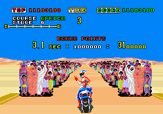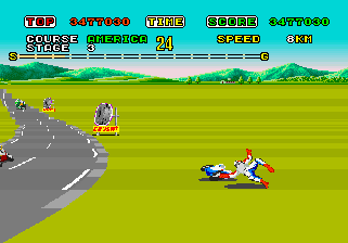 Ouf, Super Hang-On n’a pas piqué toutes ses idées à Out Run. On peut même considérer que le principal atout de cette suite réside justement dans la présence de ce fameux turbo. Celui-ci apporte un gain de vitesse qui change totalement le rythme de la progression. Turbo enclenché, votre moto file à toute vitesse, tellement vite qu’elle se permet parfois de heurter un autre bolide sans trop dévier de sa trajectoire. L’on est donc constamment tenté de faire parler la poudre, mais gare aux virages machiavéliques et au relief désormais taquin.