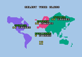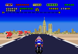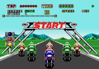 Alors que la Master System acceptait en toute humilité son rôle d’outsider, la Megadrive bombe le torse et n’a peur de rien. Plus question de repenser la réalisation avec des moyens dérisoires, il est maintenant possible de se mesurer directement avec la version arcade. Cela saute aux yeux dès l’allumage de la console. Les menus sont quasiment identiques (à part l’apparition d’un étrange mode « original » sur lequel nous reviendrons plus tard) et offrent les mêmes options : 4 parcours et 4 musiques. Même impression à l’apparition de la grille de départ, il ne manque que la fumée de cigarette pour se croire dans une salle d’arcade.