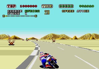 Enfin, intéressons-nous au mode « original » qui n’existe pas en arcade. Il s’agit d’un mode « carrière » dans lequel vous devrez battre plusieurs adversaires dans un circuit inédit au décor spartiate. Chaque course rapporte de l’argent qui vous permet de réparer votre moto ou d’améliorer ses performances. Intéressant sur le papier, ce mode est pourtant d’un ennui mortel. Il présente en effet un énorme défaut en vous faisant commencer l’aventure avec une moto aux performances ridicules. Cela a pour effet de décourager directement le joueur impatient qui n’a pas envie d’attendre de pouvoir améliorer son véhicule pour enfin prendre du plaisir. L’amateur de jeux d’arcade comprendra aisément ce sentiment et retournera aussitôt à l’autre mode de jeu.