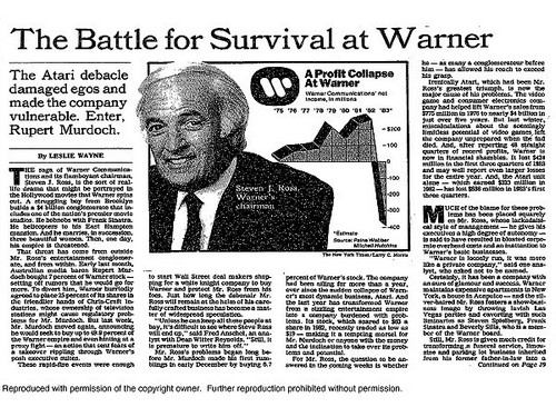 Article du New York Times datant de janvier 84 sur les déboires financiers d'Atari et, conséquemment, de la Warner.