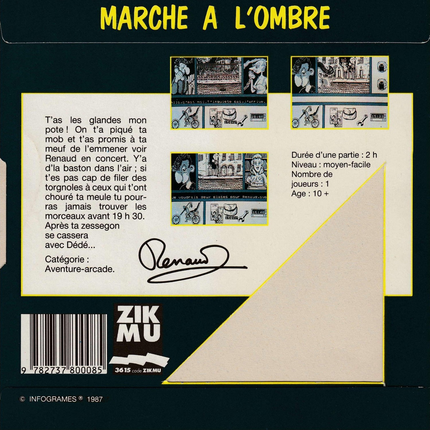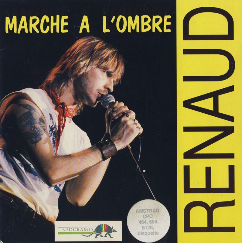 Image provenant du site cpcrulez.fr. Voici un jeu qui ne me fout pas les glandes, et qui mérite de faire partie de mon monde. Je ne lui dirai jamais de quitter le cercle de mes jeux préférés ou qu'il doive se casser à cause de l'incommodité olfactive qu'il peut me causer. Et je ne lui dirai pas de rester dans l'ombre de l'histoire vidéo-ludique... ![]() Y'a t-il eu beaucoup de jeux sur (ou inspirés par) des chanteurs populaires, et français de surcroît ? Y'a t-il eu beaucoup de jeux sur ou inspirés par Renaud Séchan ? A vrai dire je n'en sais rien (ndJC : on peut toujours se remémorer MoonWalker (1990) mettant en scène Mickael Jackson, ou dans une moindre mesure Moktar (1991) avec Vincent Lagaf'. Le reste se limite généralement à du CD à peine interactif pour fan inconditionnel), mais ce qui est sûr, c'est que ce soft d'Infogrames est sans nul doute le seul rendant hommage à Renaud et l'un des rares osant s'attaquer à un genre vidéo-ludique très peu représenté et fort casse-gueule : le jeu vidéo réalisé en l'honneur d'une personnalité médiatique. En tout cas, le succès de notre chanteur énervant national pendant les années quatre-vingt se mêlant aux âges d'or de l'Amstrad CPC et de l'Atari ST, est pour moi un heureux télescopage, ce genre d'événements à marquer d'une pierre blanche et qui resteront à jamais ancrés dans ma mémoire de gamer... Bizarres années où il n'était pas surprenant qu'un jeu comme Renaud 'Marche à l'Ombre' ait pu voir le jour... Je vais parler principalement ici de la version CPC qui a longtemps été la seule que je connaissais, je la traiterai en faisant un petit crochet par la version ST. Il est à noter qu'il existe une version C64 ainsi qu'une adaptation sur TO8, et que le jeu a même été exporté hors de la France sous le nom Sidewalk. ![]() ![]() Paragraphe un... tatatinnnn !Il fut un temps où le CPC était une sacrée machine. Pas pour ses capacités, mais pour l'extraordinaire réaction en chaîne qu'elle entraîna, celle de la conquête d'un grand public qu'elle parvint à rapidement amadouer, bluffant et charmant comme une traînée de poudre une foule de futurs aficionados du 'dixième art'. Grâce à la machine d'Amstrad, c'est au moins ma façon de voir les choses, une micro informatique familiale française venait d'émerger. L'une des premières manifestations de cette réaction en chaîne fut l'engouement des professionnels et le nombre d'informaticiens créatifs qui ont pu travailler dessus... Parmi les héros d'alors, citons Serge et Ludovic Hauduc et Jacques Hémonic d'ERE ; Didier et Olivier Guillon, les créateurs de Sapiens ; Alain Brégéon et Patrick Beaujouan, les créateurs du Passager du Temps ; ou encore Eric Chahi. Chacun travaillait alors en indépendant, proposant son travail à tel ou tel éditeur, libre de refuser ou pas des projets qui n'étaient pas autant plombés par l'argent et la recette facile... Tant de créativité et de liberté potentielle laisse aujourd'hui songeur. Les noms qui se cachent derrière Renaud - Marche à l'Ombre sont ceux de Kamel Bala, à la programmation, et Didier Chanfray aux graphismes. Ils font partie de cette cohorte besogneuse et créative qui ont défriché les immenses territoires ludiques que désormais nous connaissons bien... ![]() ![]() Ah, marcher cinq minutes avec toi, pi jouer au CPC... tant qu'en y'a...Renaud - Marche à l'Ombre m'est apparu un jour de 1989 alors que je ne connaissais pas le chanteur, et encore moins la chanson-titre, laissant ses compositions imprégner les oreilles paternelles post-soixante-huitardes ; m'enfonçant de mon côté dans une overdose d'idéal numérique et futurologique, vénérant Jean-Michel Jarre et Vangelis en croyant que le synthétiseur serait l'instrument qui trônerait pour toujours en tant qu'aboutissement de siècles de créations musicales. "Ah, que je me suis lourdement gouré !", devais-je me dire à moi-même quelques années plus tard, le mal étant réparé et Renaud Séchan ayant pris la place qu'il méritait dans mon jugement esthétique et musical... Rentrons maintenant dans le vif du sujet. Comment se présente ce jeu qui est l'une des petites réalisations dont beaucoup raffoleraient aujourd'hui d'en revoir un remake flash quelque part sur le Web ? Tout d'abord il commence par un écran d'intro qui nous offre une image digitalisée très réussie de Renaud, le tout avec la musique de Marche à l'Ombre qui l'accompagne. Sur CPC, je trouve que ça a de la gueule. Sur ST, le topo est le même. Bien sûr les possibilités techniques du ST font que c'est quand même plus beau et plus fin. Pourtant, le ST ne nous donnera pas à voir des graphismes en couleurs : bande dessinée à l'encre de chine, c'est le look intemporel de ce jeu. ![]() ![]() Description du jeu... Ah je veux !En appuyant sur une touche, après un temps de chargement, on entre dans le vif du sujet, dans le jeu et là... Horreur ! La ruelle est sombre et crade, les bourgeois s'endorment au loin comme des cons, et moi je suis le p'tit loubard qui apparaît à l'écran, hyper vénère de m'être fait détrousser de tous mes attributs virils, c'est-à-dire des parties mécaniques qui composent ma mob ! Rapiécer une mobylette, en retrouver tous les éléments et les remonter ! Partir à l'assaut de cette quête insensée dans une banlieue qui, si elle n'est pas rouge, sera en tout cas bientôt tapissée de sang, voilà un objectif dont l'originalité est à inscrire au panthéon des intrigues vidéo-ludiques les plus audacieuses... Tatatin ! D'autant plus que ce soir, il y a le concert du chanteur énervant et que j'ai promis à Françoise de l'y emmener, j'pourrai enfin me la faire, il était temps ! Surtout que Dédé est en train de lui tourner autour pour me la piquer, y'a vraiment pas de justice dans ce triste monde, non mais c'est vrai quoi à la fin... Deuxième quête insensée : gauler deux places pour le concert de Renaud.