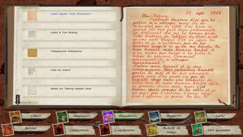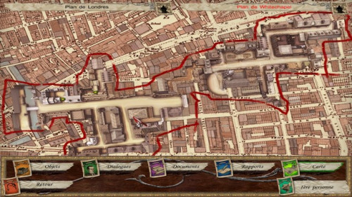 Sherlock Holmes contre Jack L’éventreur (2009, PC - Xbox 360)Le développement de Sherlock Holmes contre Jack l’éventreur commence pendant celui de Sherlock Holmes contre Arsène Lupin et si ce dernier fut rondement mené, ce ne sera pas le cas de ce volet de clotûre de la trilogie thématique, dont la gestation sera plus longue que d’habitude. Cette fois, le studio décide de procéder à un béta test et désigne pour cela plusieurs joueurs amateurs de jeux d’aventure ayant déjà pratiqué les précédents épisodes, la sélection se faisant via un questionnaire en anglais. Mais ce n’est pas le seul facteur lié au temps puisque pour la première fois, le studio développe en parallèle une version console (Xbox 360) et, surtout, se livre à d'intenses recherches. En effet, Jack l’éventreur est l’un des tueurs les plus connus de l’Histoire du fait de la violence de ses meurtres et, surtout, du mystère qui les entoure car jamais on ne réussit à l'identifier ni éclaircir ses motivations. Au mieux ne reste-t-il que des hypothèses, voire des théories allant du crédible au fantaisiste. Autant dire qu’un tel criminel avait tout pour nourrir l’imagination des auteurs de fictions à travers le temps, dans tous les médias possible. Évidemment, l’idée de le confronter au plus grand des détectives s'est imposée à de nombreuses reprises, les deux personnages étant, qui plus est, contemporains (la rencontre a même eu lieu deux fois au cinéma). Le jeu vidéo ayant déjà exploité ce concept avec, entre autres, The Lost Files of Sherlock Holmes : The Case of the Serrated Scalpel testé par Laurent sur le site, Frogwares avait fort à faire pour se distinguer. ![]() Sherlock Holmes et John Watson sont au calme dans leur appartement du 221B Bakerstreet en ce mois de septembre 1888. Et c’est pendant une de leurs discussions nocturnes qu'a lieu un meurtre, fait divers qui fait rapidement la une des journaux. C’est suite à la lecture de l’un d’eux par Watson que Holmes et son ami décident de se rendre à Whitechapel afin de démasquer l’assassin. Ils ne savent pas encore que l’enquête sera plus longue et complexe que prévu. ![]() La première chose frappante à signaler est que le jeu est techniquement plus abouti que ses prédécesseurs. Certes, le moteur graphique a toujours plusieurs années de retard sur son époque, mais il y a un vrai progrès dans le rendu. Les personnages sont mieux animés, les décors plus détaillés et les rues paraissent plus vivantes grâce aux PNJ qui s’y déplacent. De même, le doublage, sans forcément atteindre des sommets, se montre correct. Comme je l’ai dit, le jeu est techniquement dépassé et pourtant, étrangement, ce côté daté ne gêne pas outre mesure, au contraire, il a plutôt tendance à servir l’atmosphère du jeu, qui se paie même le luxe d'une mise en scène assez réussie. ![]() ![]() Contrairement aux titres antérieurs du studio, il n’y a pas de version remasterisée mais le jeu proposait dès sa sortie d’indiquer à l'écran les points d'intérêt ou de choisir le point de vue (première ou troisième personne). Il offre aussi quelques autres nouveautés et marque le retour d'options précédemment abandonnées. Ainsi, comme dans Sherlock Holmes et la boucle d’argent, il convient de poser plusieurs questions aux personnages rencontrés, ce qui oblige parfois à des aller-retours (heureusement le déplacement rapide via la carte permet de faire abstraction de ce problème). Si les énigmes se montraient souvent trop dures et longues dans l’épisode avec Arsène Lupin, celui-ci est bien plus équilibré. Certes on pourra toujours tomber sur un os et piétiner un petit moment, mais rien d’insurmontable. ![]() Mais le principal ajout de cet épisode est l’arrivée des phases d’enquête. En effet, on ne se contente plus de résoudre des casse-têtes et de répondre à des questions. Plus d’une fois, on sera conduit à examiner des scènes de crime, inspecter des corps de victimes et récolter des indices. Mais ce n’est pas tout, on procèdera aussi à des reconstitutions d'événements. Tout ceci introduit la grande nouveauté du jeu : les phases de déduction. Avec les différents témoignages et/ou indices récoltés, vous devrez faire un bilan de l’ensemble des éléments d'enquête et émettre des hypothèses ou affirmations. Cela peut prendre diverse formes mais, plus que jamais, on se sent vraiment en train de mener une enquête. ![]() ![]() En voyant la jaquette du jeu avec les visions iconiques de Holmes et sa casquette, et l’ombre de Jack l’éventreur, on pourrait s’attendre à un jeu cumulant les clichés et idées reçues sur ses deux protagonistes. Mais finalement c’est tout le contraire qui se produit, et c’est sur ce plan que la qualité du travail de Frogwares se révèle. Sherlock Holmes contre Jack L’éventreur n’est pas une revisite fantaisiste des évènements visant le pur divertissement, il se veut réellement crédible et fidèle à l’Histoire. Dites-vous bien que si certains détails des énigmes et les indices pour les résoudre, ainsi que quelques personnages, sont inventés, la plupart des suspects et témoins que vous croisez, des documents que vous consulterez, des lieux que vous visiterez et des évènements qui se produiront viennent de la véritable affaire ou lui sont périphériques. Frogwares a beaucoup étudié son sujet et consulté divers spécialistes de Jack l’éventreur pour mener à bien sa tâche, et cela se sent. Même l’identité du coupable reprend une hypothèse défendue par certains experts. ![]() J’en profite pour m’attarder sur un élément : un point qui a surpris au moment où le jeu est sorti est la façon dont sont représentées les victimes, avec des dessins stylisés tout en retenue, là où les précédents épisodes et les suivants affichent des images réalistes et crues. Il y a une ra
