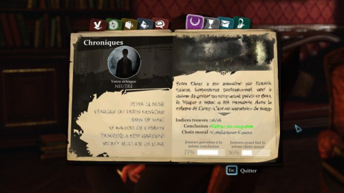 Sherlock Holmes Crimes et Châtiments (2014, PC - PS3 - Xbox 360 - PS4 - Xbox One)Le testament de Sherlock Holmes a reçu de bonne critiques et semble avoir trouvé son public. Le pari d’installer la franchise sur les console de salon semble donc remporté. Pour autant, ce n’est pas le moment pour Frogwares de se reposer sur ses lauriers car la nouvelle génération de consoles arrive et il va falloir attirer l'attention du public potentiel qu'elle représente. Bref, comme dit dans la page précédente, Frogwares va tenter avec cet épisode de renouveler la formule de sa saga, aussi bien sur la forme que sur le fond. Voyons si le pari est gagné. ![]() On ne peut pas vraiment parler du scénario du jeu Sherlock Holmes Crimes et Châtiments, non qu’il n’y en ait pas, au contraire, il y en a plusieurs. Vous l’avez deviné, on tient là la première nouveauté de cette épisode, à savoir le fait qu'il ne s'articule pas autour d'une enquête mais de six. Notons que deux de celles-ci sont des adaptations directes de nouvelle de Conan Doyle. ![]() Encore une fois, on est surpris par l’évolution technique du jeu. Si Le testament de Sherlock Holmes avait montré une progression sur ce plan, on ne s’attendait pas à ce que cela se reproduise dès l’épisode suivant. Le jeu est très beau, que ce soit dans ses décors ou ses personnages. De même, il y a une amélioration dans l’animation, plus souple. Cela vient de ce que Frogwares a laissé tomber son moteur graphique maison au profit de l’Unreal Engine 3, ce qui a laissé à ses équipes plus de marge de manoeuvre pour travailler la partie artistique de son jeu d'enquêtes. L’ambiance visuelle est ainsi très réussie. ![]() Vous avez noté que j’emploie beaucoup le mot "enquête" dans cet article. Ce n’est pas pour rien car c’est définitivement ce à quoi on a affaire. Si le précédent épisode plaçait en retrait les séquences de reconstitution ou de récolte d’indices pour privilégier les énigmes et casse-têtes, Crime et Châtiment fait exactement l’inverse. La plus grosse partie de votre temps sera ainsi consacrée aux indices et témoignages. Il y aura bien sûr des épreuves de réflexion, mais elles resteront en retrait, moins diversifiées et surtout bien plus simples. Bref, si vous cherchez du défi dans ce domaine, vous serez déçu(e). ![]() Si le jeu peut décevoir les fans de sport cérébral, il devrait pleinement satisfaire ceux qui apprécient avant tout chercher à coincer des coupables potentiels. C’est d’ailleurs cette partie du jeu qui offre le plus de changements sur le plan du gameplay. ![]() Tout d’abord, signalons que la vue point & click est abandonnée. On se contentera des vues à la première personne et de dos. Le sixième sens, système récurrent dans la série, a changé de fonction. Désormais il ne sert plus à faire apparaître les éléments intéressants du décor car ceux-ci sont directement visibles lorsque vous vous en approchez. Le sixième sens permet à présent de mettre en évidence des éléments et indices cachés, insistant davantage sur l’aspect recherche. Il y a également un mode de vision permettant d’imaginer des événements, mais il n'est utilisable qu’à des moments précis. Lors des interrogatoires, il est désormais possible d’"analyser" les personnages afin d’obtenir des informations les conçernant, voire de débloquer de nouvelles questions. Enfin, notons le retour de plusieurs séquences de reconstitution, élément qui avait été mis en retrait sur le précédent épisode. ![]() Maintenant que l’on a parlé des petites nouveautés, abordons les séquences de déduction, à savoir LE grand changement de cet épisode. Le système a fait peau neuve et pas seulement d’un point de vue esthétique, son fonctionnement a changé et il est encore plus primordial qu’auparavant. Il s’agit même du cœur du jeu. Expliquons d'abord son fonctionnement : à chaque fois que vous trouvez un indice, ce dernier est visible dans le "tableau d’indices". Il faudra recouper deux indices afin d’émettre une hypothèse, généralement double (par exemple "M.X était là" ou "M.X n’était pas là"), puis il faudra faire des choix entre les différentes hypothèses afin d’amener cetaines déductions. À ce stade, il est important de noter une chose : les déductions que vous faites peuvent conduire à explorer d’autres lieux, provoquer des reconstitutions, et surtout ontenir d’autre indices. ![]() Voilà ce qui fait tout le sel de cet épisode : les hypothèses mènent à des déductions qui elles-mêmes mènent à une conclusion. Or, et c’est là tout l'intérêt, il y a plusieurs conclusions possible. Selon les hypothèses que vous choisissez et validez, le coupable du meurtre ou sa manière d'agir seront totalement différents. Bref, vous pouvez accuser n’importe lequel des suspects. Bien sûr, il n’y a qu’un seul vrai coupable et une seule arme, et il ne tient qu’à vous de les trouver. Le jeu ne vous dira si vous avez fait le bon choix qu’à la fin de l’enquête, et seulement si vous le voulez. C’est en cela qu'il se montre gratifiant, pour le joueur, car il fait appel à ses propres déductions, fondées sur ce qu’il a lui-même découvert. Ce sera à lui de décider si certaines hypothèses tiennent la route et le jeu laisse plusieurs indices plus ou moins subtils pour le déterminer. Cette idée de distinguer un coupable n’est pas nouvelle dans l’univers du jeu vidéo. Elle est surtout présente dans L.A Noire... Mais elle se montre ici bien mieux exploitée, de manière plus convaincante que dans le jeu de Rockstar (où c'est surtout le scénario global, indépendant du résultat des enquêtes, qui compte en définitive). ![]() ![]() En plus de trouver le coupable, vous déciderez, ou pas, de le livrer à la justice. Il n’y a pas de "choix juste", tout dépendra de votre point de vue. À la fin de l